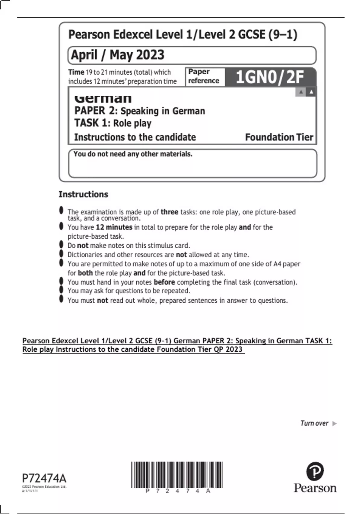Pearson Edexcel Level 1/Level 2 GCSE (9–1) German PAPER 2: Speaking in German TASK 1: