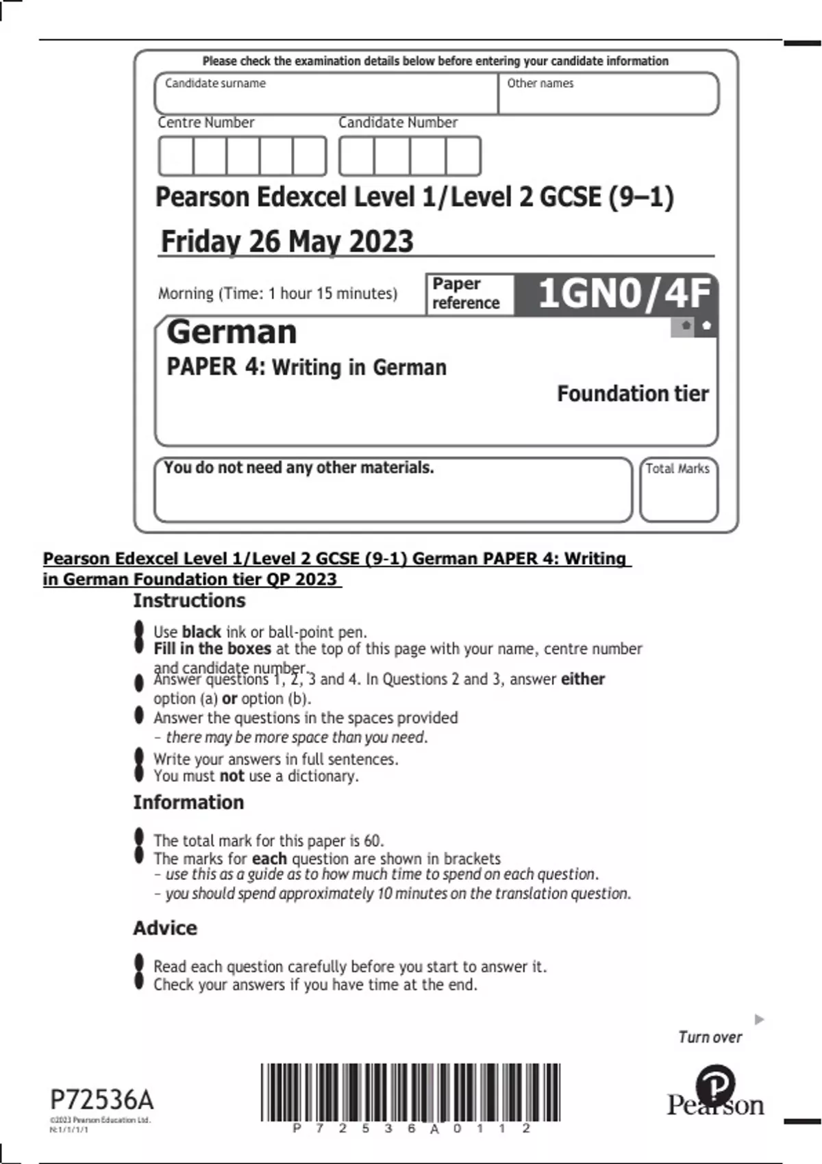 Pearson Edexcel Level 1/Level 2 GCSE (9–1) German PAPER 4: Writing in German Foundation tier QP 2023