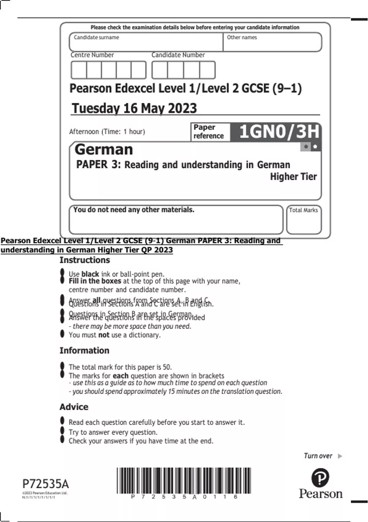 Pearson Edexcel Level 1/Level 2 GCSE (9–1) German PAPER 3: Reading and understanding in German Higher Tier QP 2023