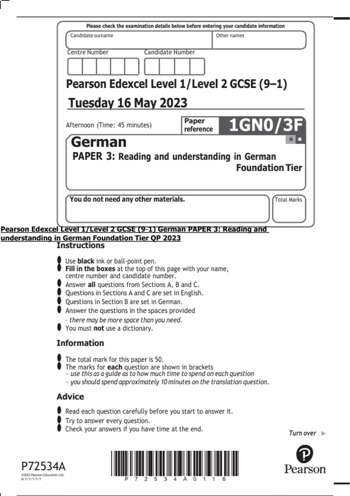 Pearson Edexcel Level 1/Level 2 GCSE (9–1) German PAPER 3: Reading and understanding in German Foundation Tier QP 2023