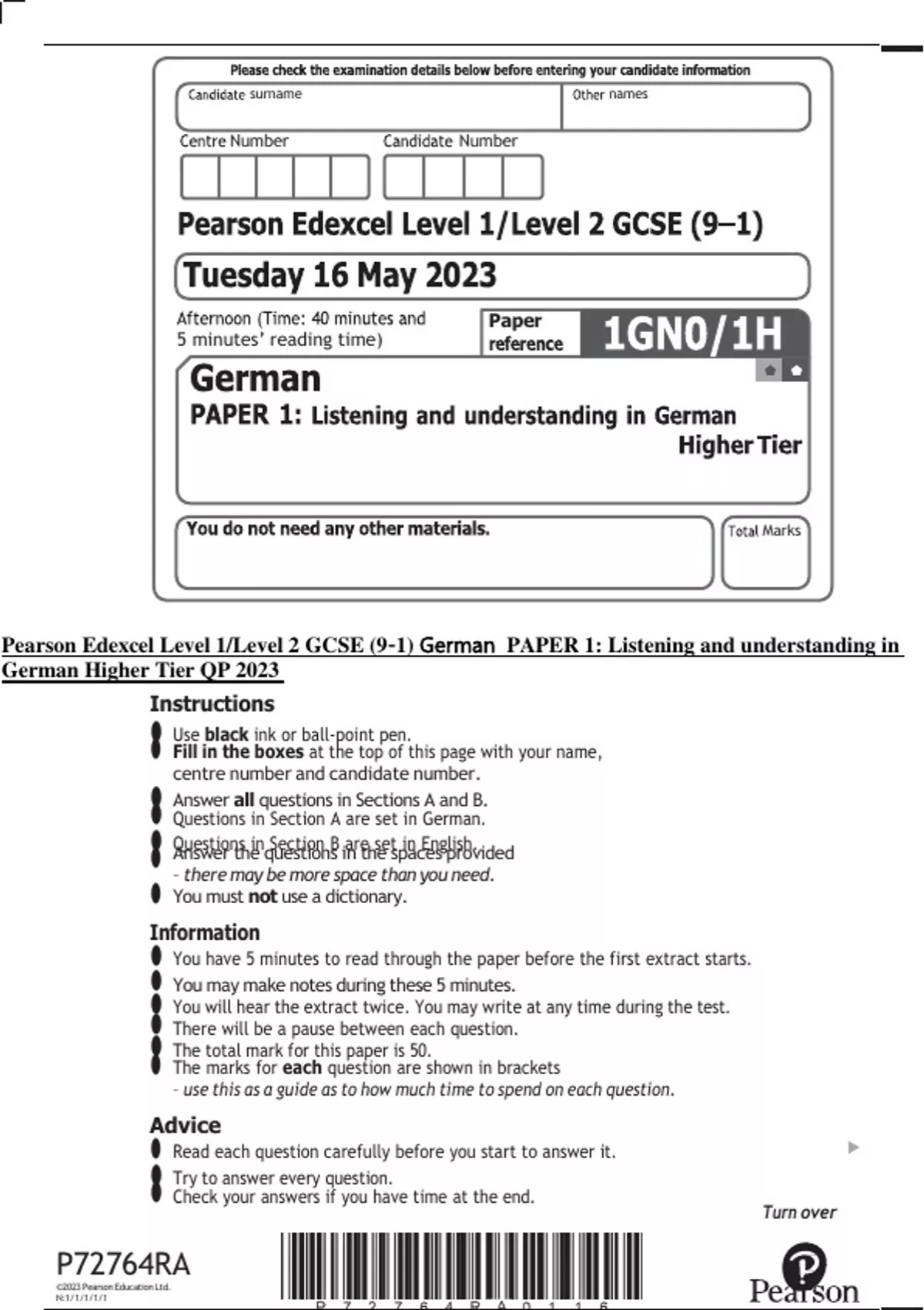 Pearson Edexcel Level 1/Level 2 GCSE (9–1) German PAPER 1: Listening and understanding in German Higher Tier QP 2023