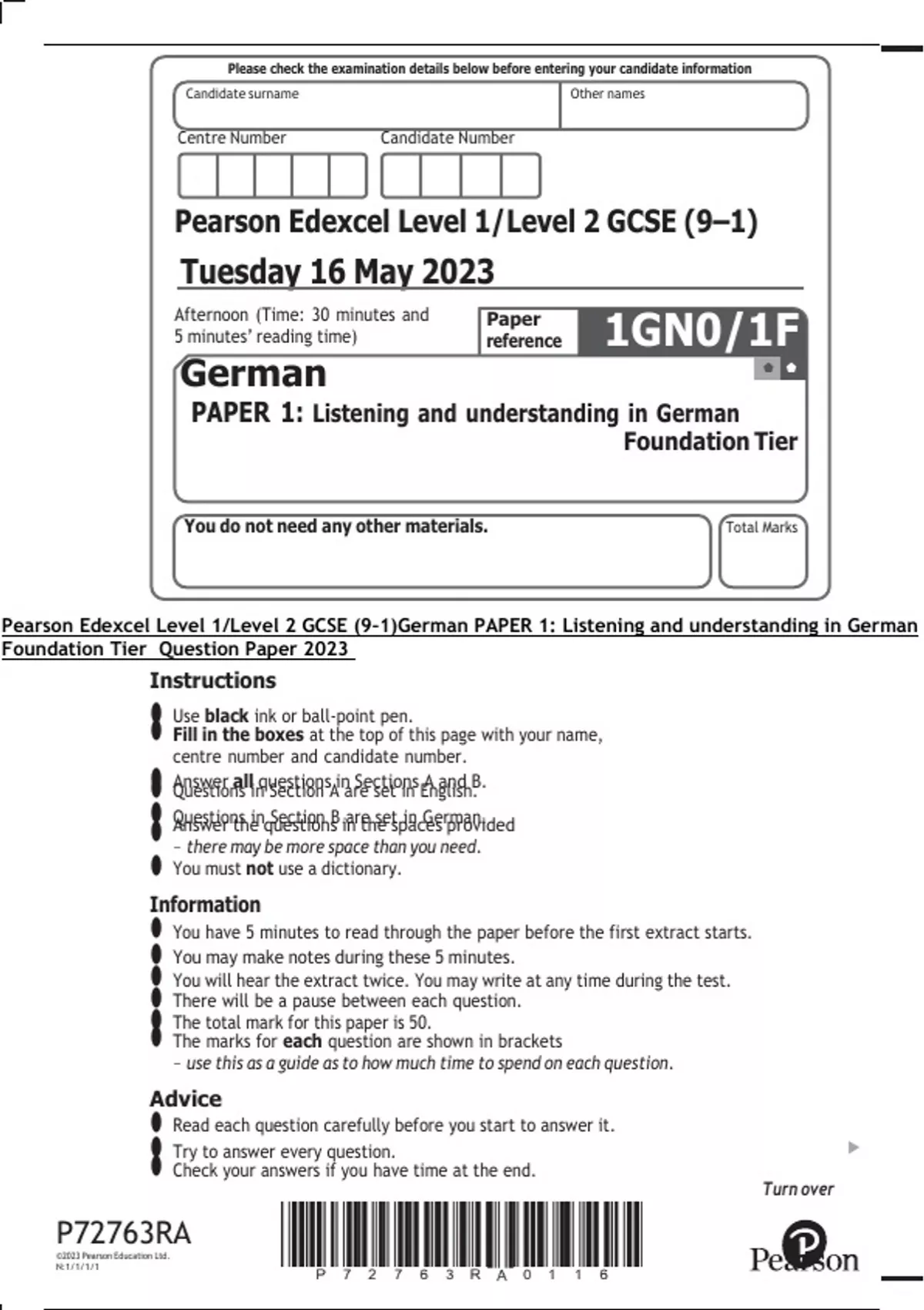 Pearson Edexcel Level 1/Level 2 GCSE (9–1)German PAPER 1: Listening and understanding in German