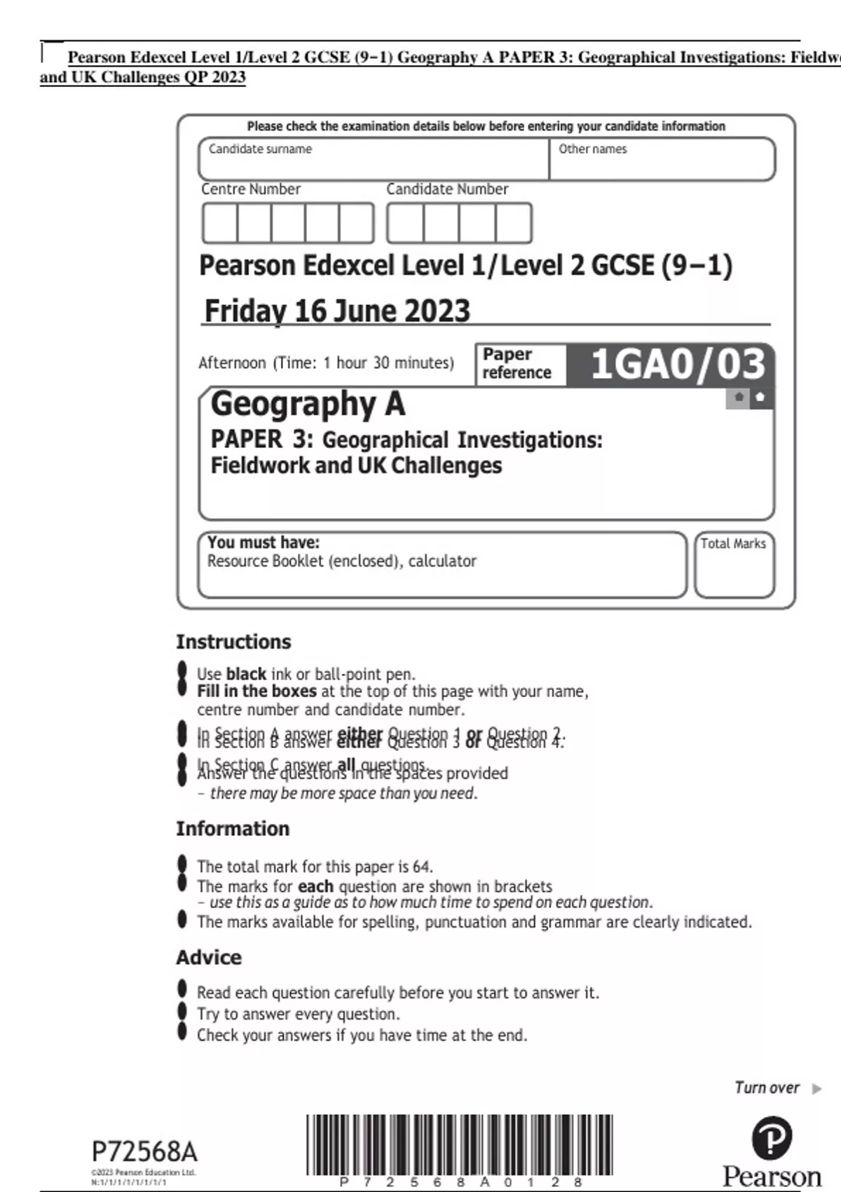 Pearson Edexcel Level 1/Level 2 GCSE (9−1) Geography A PAPER 3: Geographical Investigations: Fieldwo