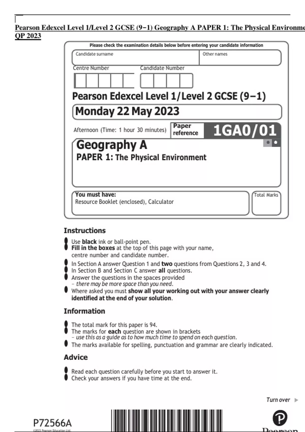 Pearson Edexcel Level 1/Level 2 GCSE (9−1) Geography A PAPER 1: The Physical Environme