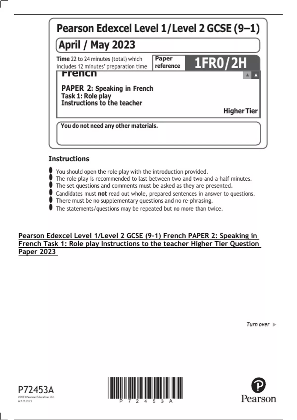 Pearson Edexcel Level 1/Level 2 GCSE (9–1) French PAPER 2: Speaking in French Task 1: Role play Instructions to the teacher Higher Tier Question Paper 2023