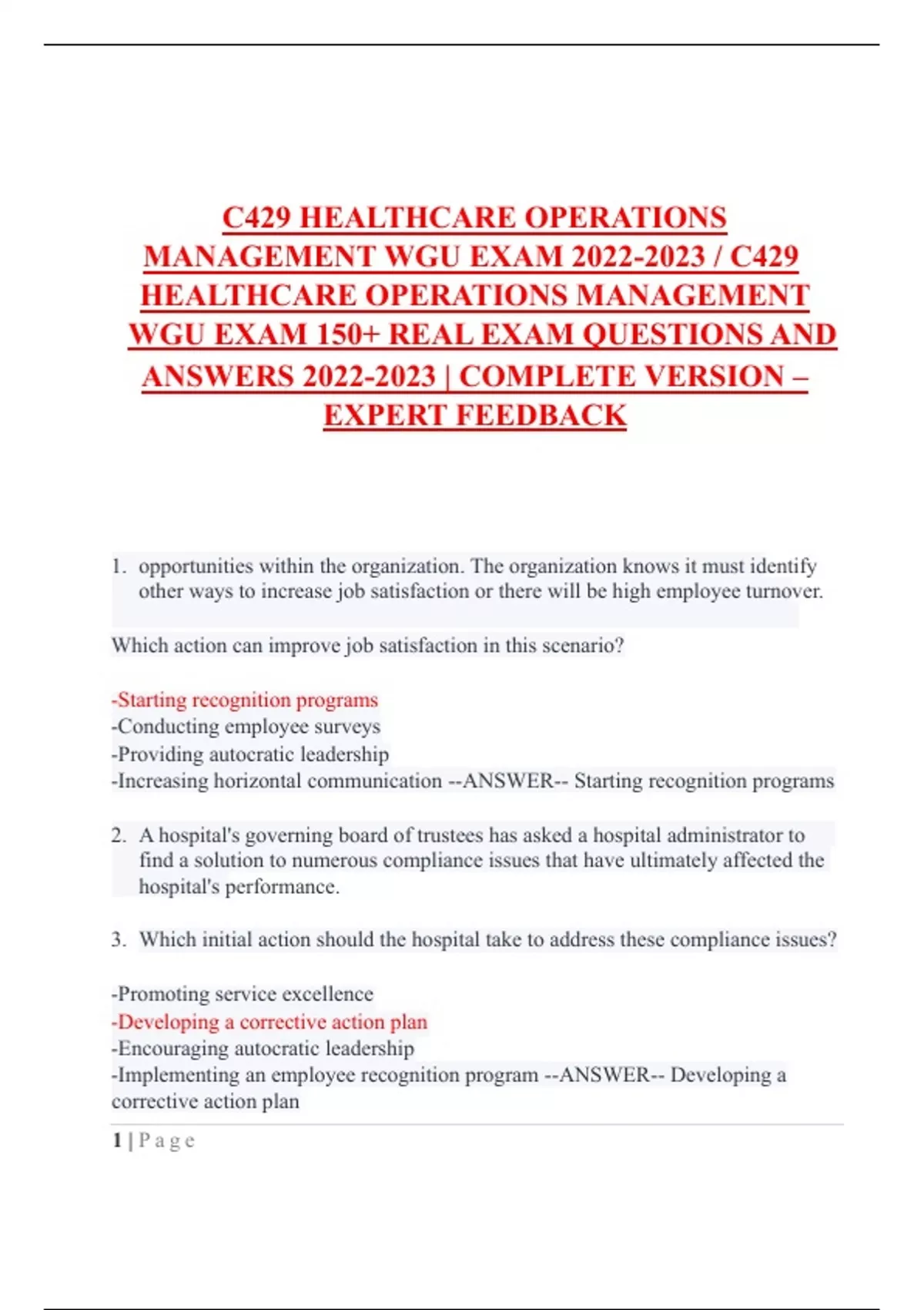 C429 HEALTHCARE OPERATIONS MANAGEMENT WGU EXAM / C429 HEALTHCARE OPERATIONS MANAGEMENT WGU EXAM 150+ REAL EXAM QUESTIONS AND ANSWERS | COMPLETE VERSION – EXPERT FEEDBACK