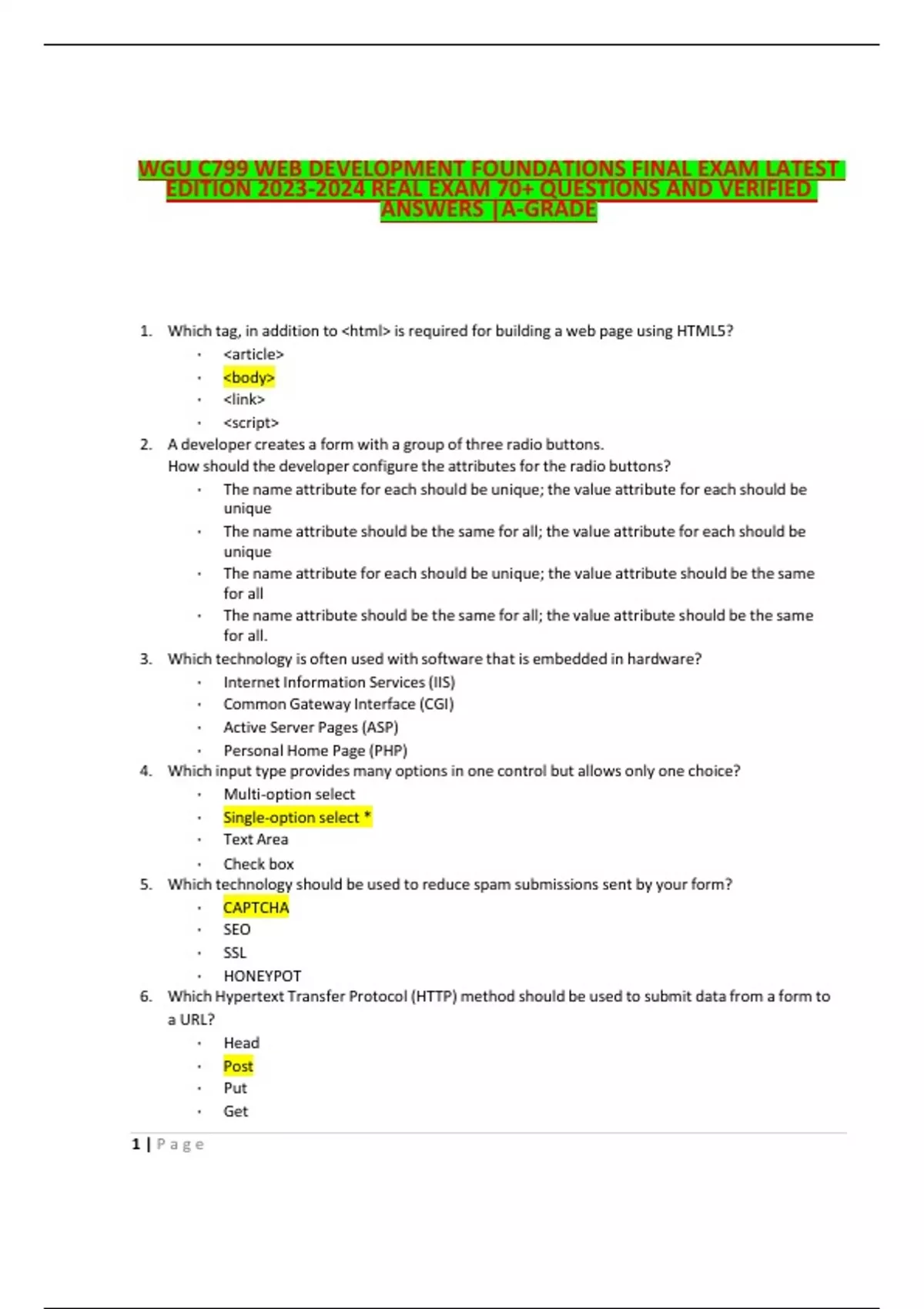 WGU C799 WEB DEVELOPMENT FOUNDATIONS FINAL EXAM LATEST EDITION REAL EXAM 70+ QUESTIONS AND VERIFIED ANSWERS |A-GRADE