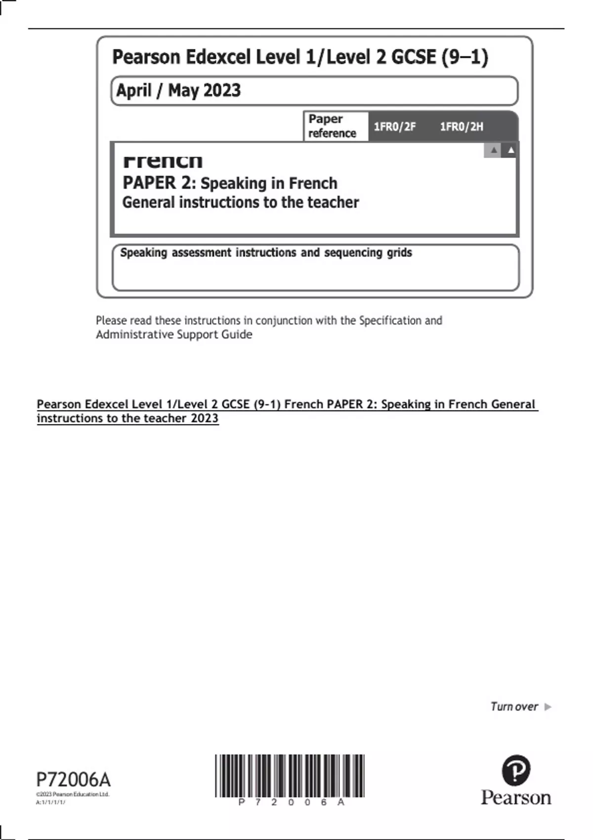 Pearson Edexcel Level 1/Level 2 GCSE (9–1) French PAPER 2: Speaking in French General instructions to the teacher 2023