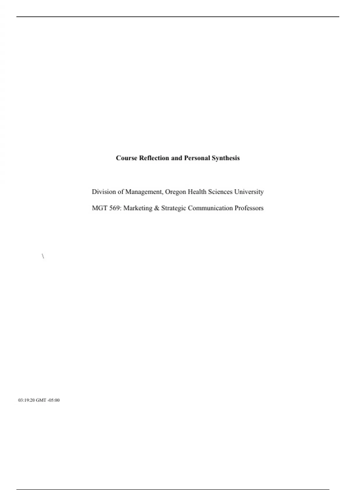 9.10 Final Draft MGT569 CourseSynthesis LopezL.docx Course Reflection and Personal Synthesis Division of Management, Oregon Health Sciences University MGT 569: Marketing & Strategic Communication Professors 03:19:20 GMT -05:00 Course Reflection and Personal Synthesis The following is a synthesis of the information I have learned regarding marketing and communications in this Marketing & Strategic Management class. The discourse will be broken down into two different main sections, which are Marketing and Communications, that will be described based on what I have learned and where I believe I absorbed the most knowledge under different key areas and some additional goals that I plan to carry with me as I progress in the industry. These are competencies that I have added to my personal knowledge base that I will build upon in my current toolkit or repertoire of understanding. I will take these lessons forward with me as I advanc
