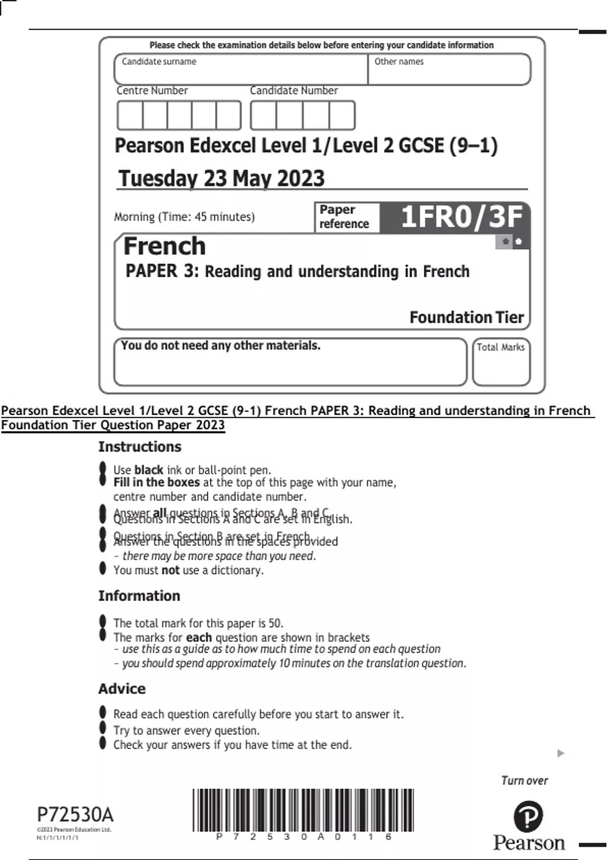 Pearson Edexcel Level 1/Level 2 GCSE (9–1) French PAPER 3: Reading and understanding in French