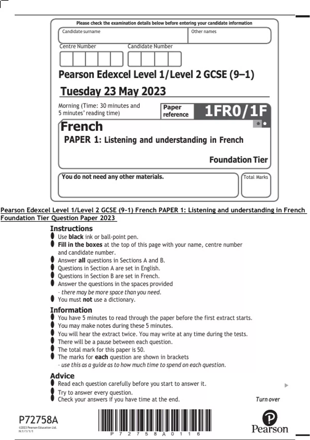 Pearson Edexcel Level 1/Level 2 GCSE (9–1) French PAPER 1: Listening and understanding in French