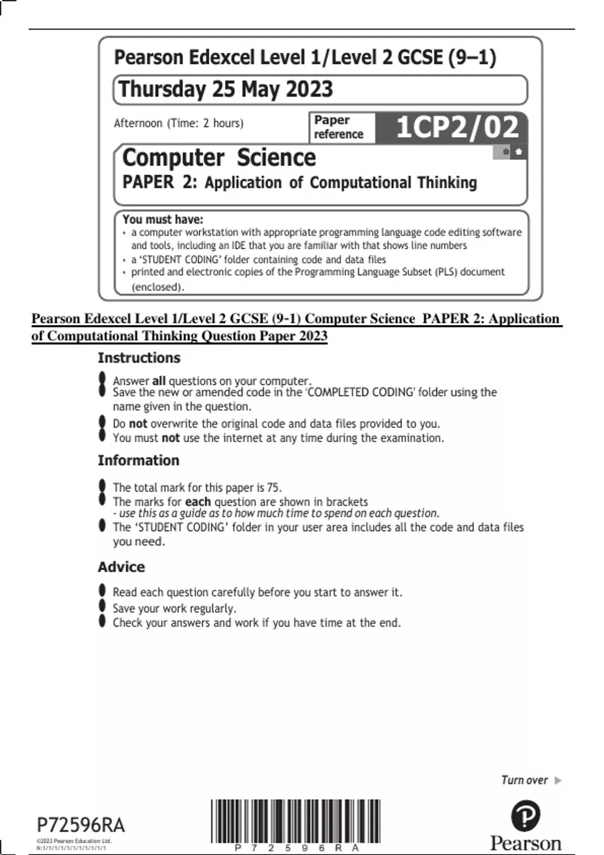 Pearson Edexcel Level 1/Level 2 GCSE (9–1) Computer Science PAPER 2: Application of Computational Thinking Question Paper 2023