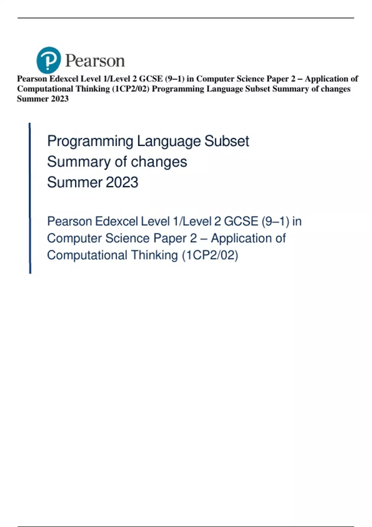 Computational Thinking (1CP2/02) Programming Language Subset Summary of changes