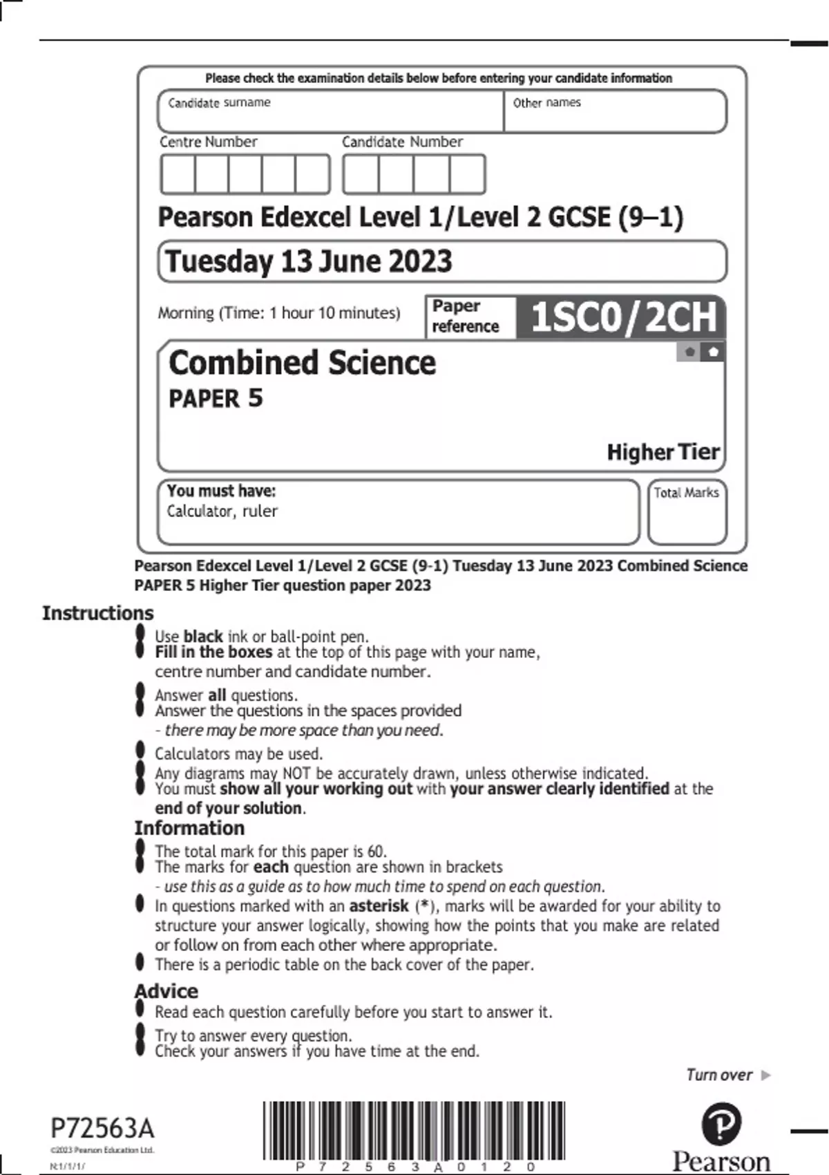 Pearson Edexcel Level 1/Level 2 GCSE (9–1) Tuesday 13 June 2023 Combined Science PAPER 5 Higher Tier question paper 2023