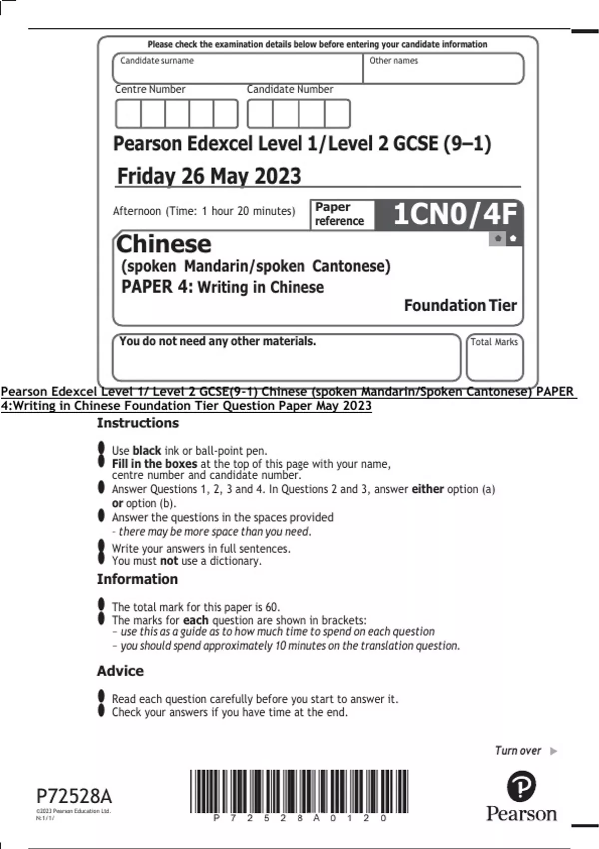 4:Writing in Chinese Foundation Tier Question Paper May 2023