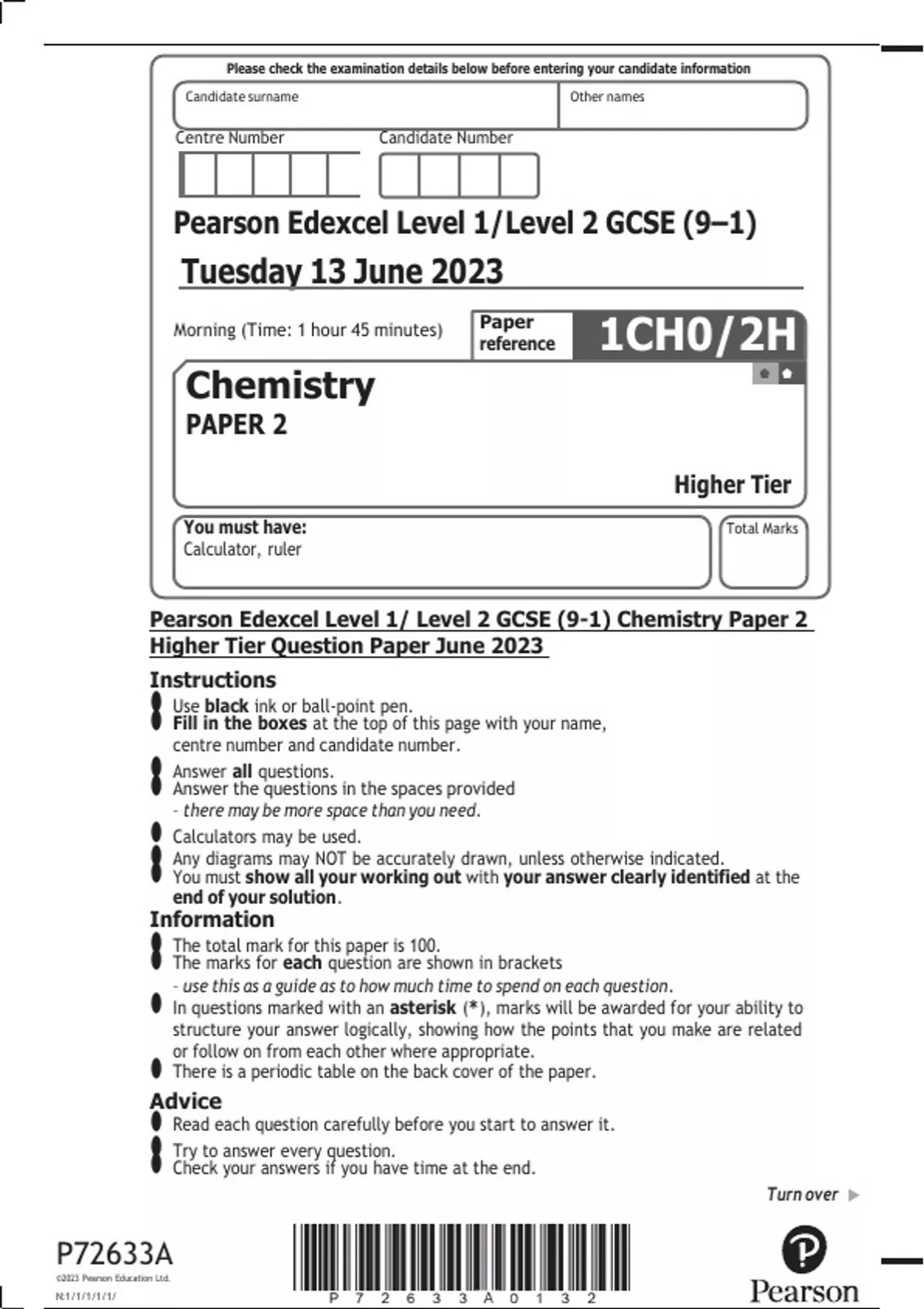 Pearson Edexcel Level 1/ Level 2 GCSE (9-1) Chemistry Paper 2 Higher Tier Question Paper June 2023