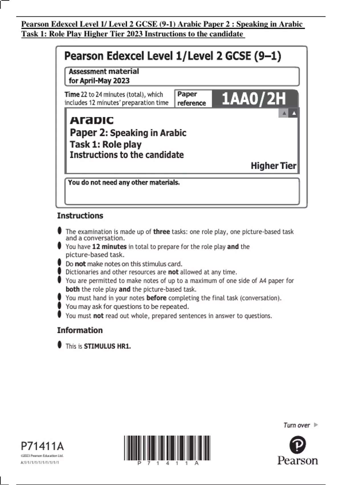 Pearson Edexcel Level 1/ Level 2 GCSE (9-1) Arabic Paper 2 : Speaking in Arabic Task 1: Role Play Higher Tier 2023 Instructions to the candidate