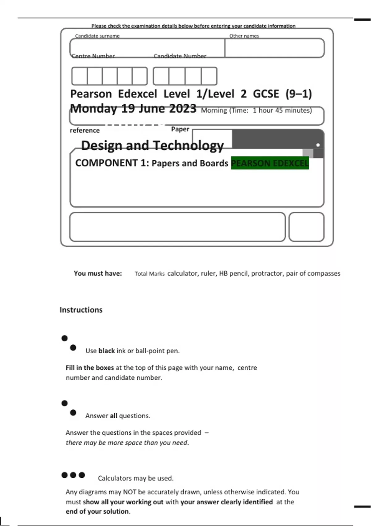 Pearson Edexcel Level 1/Level 2 GCSE (9–1)Design and Technology   COMPONENT 1: Papers and Boards QP 2023