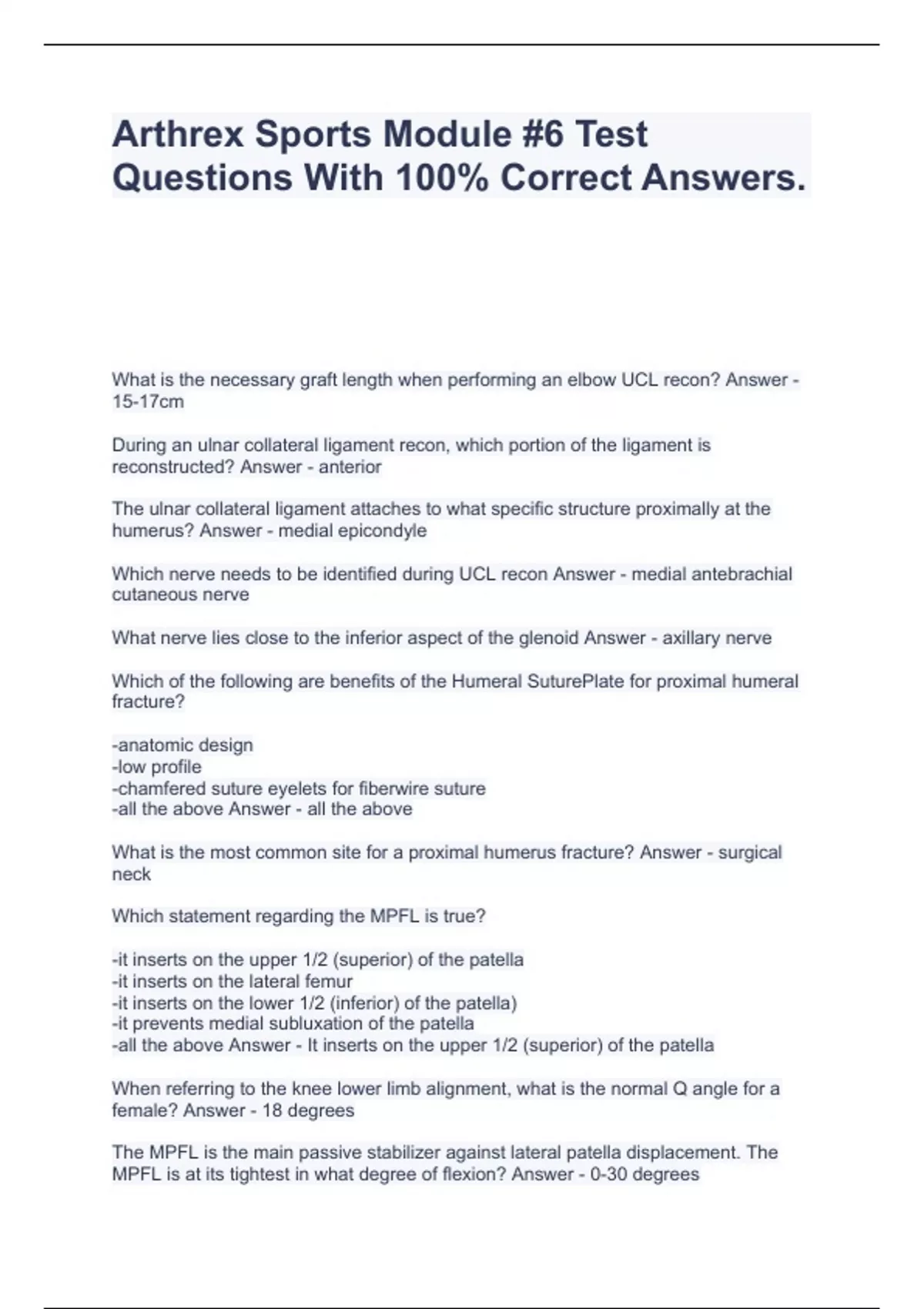 Arthrex Sports Module #6 Test Questions With 100% Correct Answers.