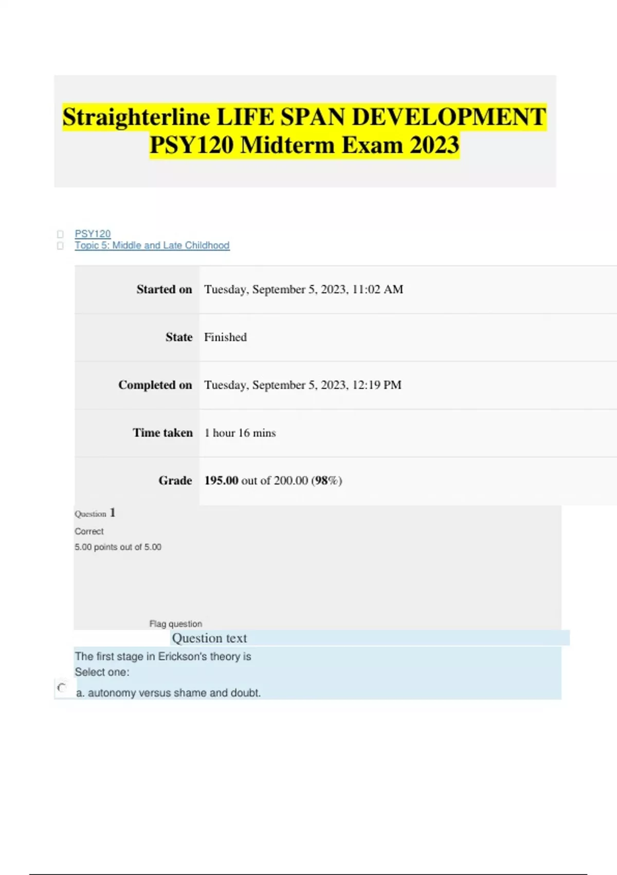 Straighterline LIFE SPAN DEVELOPMENT PSY120 Midterm Exam 2023 with complete solutions