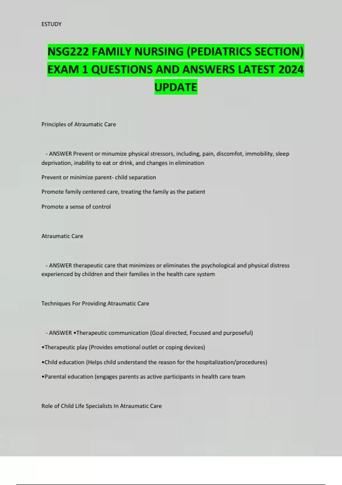 NSG222 FAMILY NURSING (PEDIATRICS SECTION) EXAM 1 QUESTIONS AND ANSWERS LATEST 2024 UPD