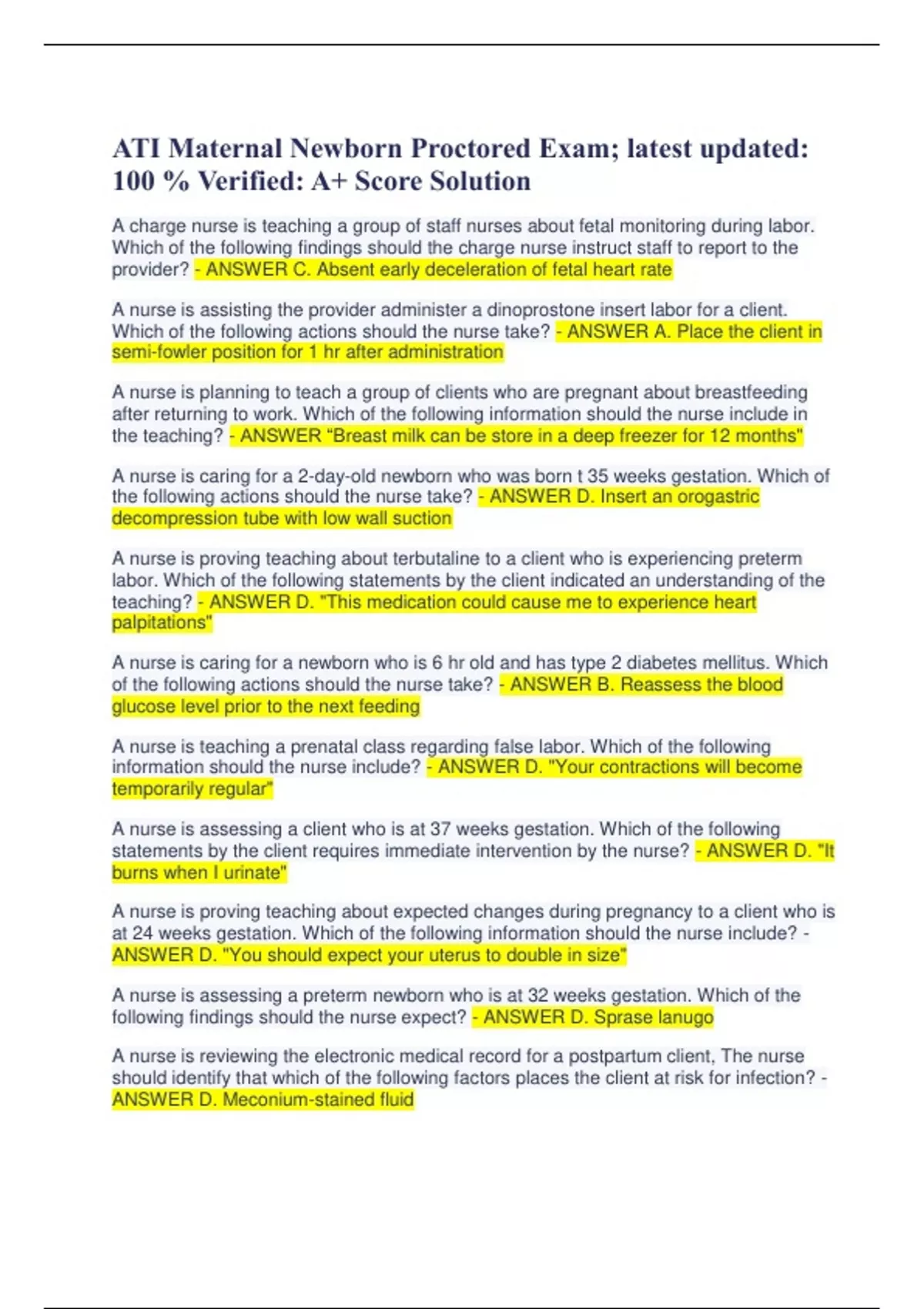 ATI Maternal Newborn Proctored Exam; latest updated: 100 % Verified: A+ Score Solution