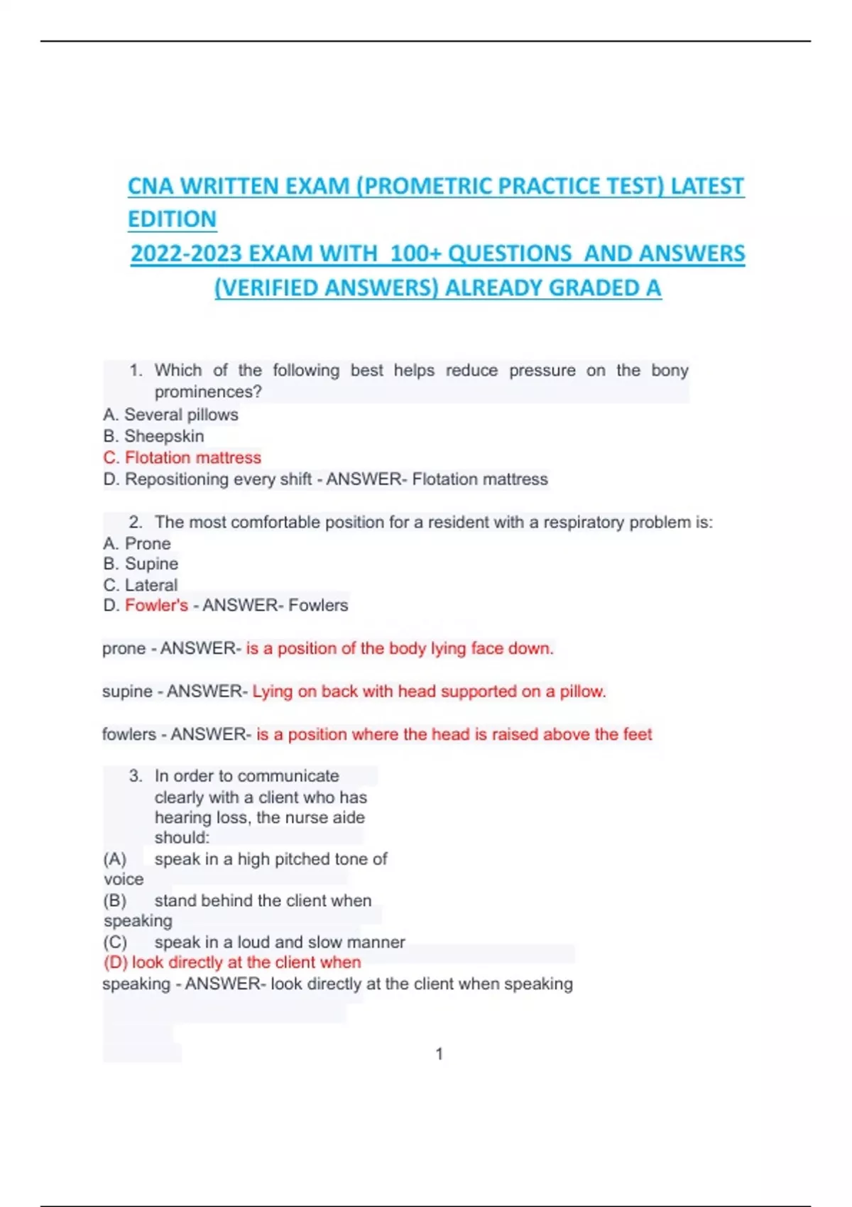 CNA WRITTEN EXAM (PROMETRIC PRACTICE TEST) LATEST EDITION EXAM WITH 100+ QUESTIONS AND ANSWERS (VERIFIED ANSWERS) ALREADY GRADED A