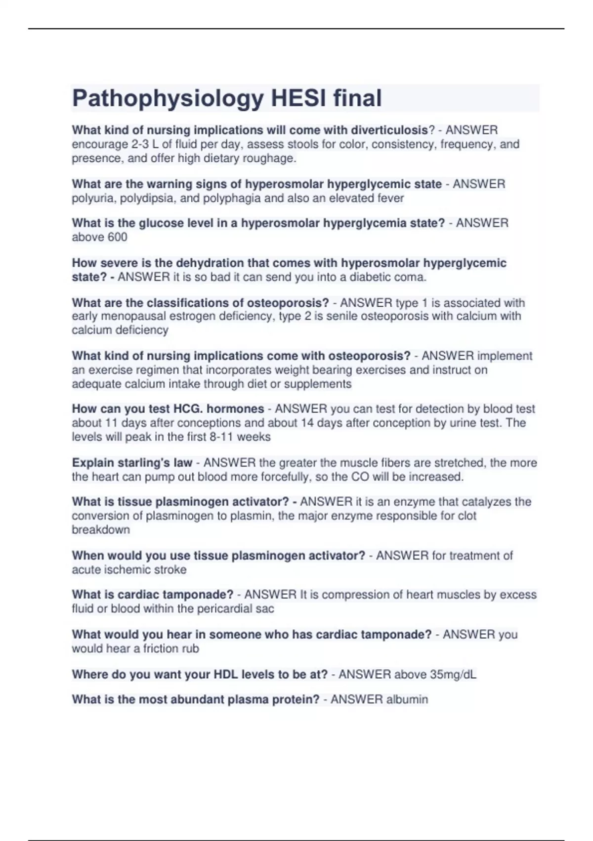 Pathophysiology HESI final What kind of nursing implications will come with diverticulosis? - ANSWER encourage 2-3 L of fluid per day, assess stools for color, consistency, frequency, and presence, and offer high dietary roughage. What are the warning signs of hyperosmolar hyperglycemic state - ANSWER polyuria, polydipsia, and polyphagia and also an elevated fever What is the glucose level in a hyperosmolar hyperglycemia state? - ANSWER above 600 How severe is the dehydration that comes with hyperosmolar hyperglycemic state? - ANSWER it is so bad it can send you into a diabetic coma. What are the classifications of osteoporosis? - ANSWER type 1 is associated with early menopausal estrogen deficiency, type 2 is senile osteoporosis with calcium with calcium deficiency What kind of nursing implications come with osteoporosis? - ANSWER implement an exercise regimen that incorporates weight bearing exercises and instruct on adequate calcium intake through diet or supplements How can you test HCG. hormones - ANSWER you can test for detection by blood test about 11 days after conceptions and about 14 days after conception by urine test. The levels will peak in the first 8-11 weeks Explain starling's law - ANSWER the greater the muscle fibers are stretched, the more the heart can pump out blood more forcefully, so the CO will be increased. What is tissue plasminogen activator? - ANSWER it is an enzyme that catalyzes the conversion of plasminogen to plasmin, the major enzyme responsible for clot breakdown When would you use tissue plasminogen activator? - ANSWER for treatment of acute ischemic stroke What is cardiac tamponade? - ANSWER It is compression of heart muscles by excess fluid or blood within the pericardial sac What would you hear in someone who has cardiac tamponade? - ANSWER you would hear a friction rub Where do you want your HDL levels to be at? - ANSWER above 35mg/dL What is the most abundant plasma protein? - ANSWER albumin What is the purpose of albumin? - ANSWER it helps move many small molecules through the blood When would you have decreased albumin? - ANSWER After weight-loss surgery, Crohn's disease, low-protein diets, sprue, whipple disease What are the 2 dysfunctions of CHF - ANSWER diastolic dysfunction and systolic dysfunction What is diastolic dysfunction? - ANSWER occurs when ventricles pump against extremely high afterload as in primary HTN What is systolic dysfunction - ANSWER occurs when ventricles experience damage as in MI and ventricle cannot contract effectively. This leads to an increase in preload. What is the pathological definition of emphysema? - ANSWER It is breakdown of elastin and collagen fiber network of alveoli whereby alveoli enlarge or walls are destroyed. How would a person's breathing be affected with emphysema? - ANSWER The person would starts to hyperventilate to maintain ABGs. Cyanosis will come later in emphysema. What is the cause of Addison's disease? - ANSWER it is a deficit of adrenocorticotropic hormones. What kind of traumas can cause hypo function of the adrenal cortex? - ANSWER surgical removal, infection or tumor of adrenal glands, head trauma (because it affects the pituitary) How is sodium affected in decreased function of the adrenal hormones? - ANSWER increased NA excretion. What is pannus - ANSWER vascular granulation tissue that forms in synovial membrane of clients with RA What are the diagnostic criteria for RA? - ANSWER morning stiffness for at least 1 hour and persisting over at least 6 weeks, arthritis with swelling or effusion of 3 or more joints persisting for at least 6 weeks. What can exacerbate MS - ANSWER stress, pregnancy, illness, fever, and fatigue What are the signs/symptoms of MS - ANSWER visual disturbances, spasticity of muscles, nystagmus, tremors, and gait instability What are the types shock? - ANSWER hypoventilation, cardiogenic, obstructive, or disruptive What causes diabetes insipidus? - ANSWER ADH insufficiency, results in excess fluid excretion cholelithiasis - ANSWER condition where there are stones present in the gall bladder How are gallstones formed? - ANSWER they formed when cholesterol and calcium precipitate as solid crystals within mucous lining of gallbladder What kind of foods should you avoid with cholelithiasis? - ANSWER high fat foods, whole milk products, hot dogs, chocolate and cheese When would you use in an intra-aortic balloon pump? - ANSWER in cardiogenic shock What would the ST segment look like post MI? - ANSWER a straight line between S wave and the beginning of the T wave What is the glucose level for hyperglycemia in diabetes? - ANSWER above 250 What will you find in the urine with diabetes? - ANSWER ketones and glucose What is the hyper osmolality level in HHNK - ANSWER above 310 What is in the urine with HHNK? - ANSWER glucose What is the level of hypoglycemia? - ANSWER below 70 What are the microvascular complications for diabetes? - ANSWER neuropathy, nephropathy, retinopathy, cardiopathy (heart disease), foot ulcerations What are the stages of general adaptation syndrome - ANSWER alarm, resistance, exhaustion What is dysentery? - ANSWER inflammation of the intestine causing diarrhea with blood. Where does amylase get produced? - ANSWER it is produced by the salivary glands and pancreas. What is benign prostatic hypertrophy? - ANSWER noncancerous enlargement of prostate gland because of hyperplasia or hypertrophy. High amylase and lipase indicate? - ANSWER pancreatitis. Why does BPH occur? - ANSWER because of an increased estrogen and a decrease in testosterone What is the cause of PAD and CAD? - ANSWER atherosclerosis