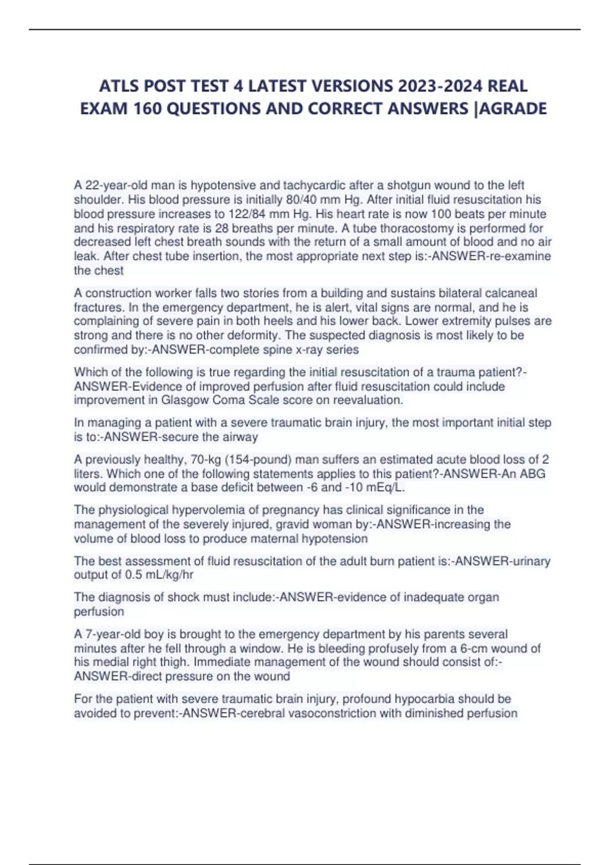 ATLS POST TEST 4 LATEST VERSIONS REAL EXAM 160 QUESTIONS AND CORRECT ANSWERS |AGRADE