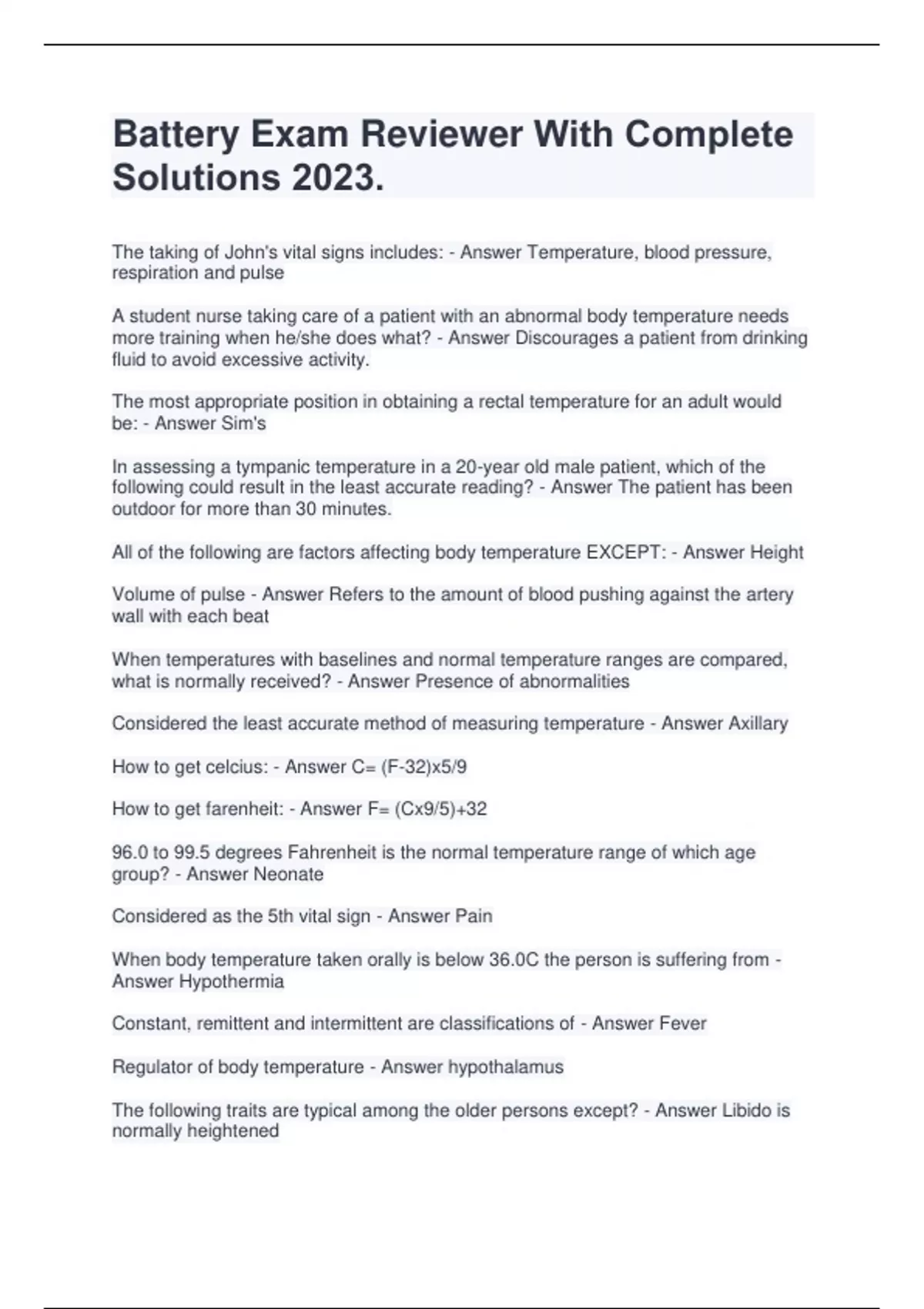 The taking of John's vital signs includes: - Answer Temperature, blood pressure, respiration and pulse A student nurse taking care of a patient with an abnormal body temperature needs more training when he/she does what? - Answer Discourages a patient from drinking fluid to avoid excessive activity. The most appropriate position in obtaining a rectal temperature for an adult would be: - Answer Sim's In assessing a tympanic temperature in a 20-year old male patient, which of the following could result in the least accurate reading? - Answer The patient has been outdoor for more than 30 minutes. All of the following are factors affecting body temperature EXCEPT: - Answer Height Volume of pulse - Answer Refers to the amount of blood pushing against the artery wall with each beat When temperatures with baselines and normal temperature ranges are compared, what is normally received? - Answer Presence of abnormalities Considered the least accurate method of measuring temperature - Answer Axillary How to get celcius: - Answer C= (F-32)x5/9 How to get farenheit: - Answer F= (Cx9/5)+32 96.0 to 99.5 degrees Fahrenheit is the normal temperature range of which age group? - Answer Neonate Considered as the 5th vital sign - Answer Pain When body temperature taken orally is below 36.0C the person is suffering from - Answer Hypothermia Constant, remittent and intermittent are classifications of - Answer Fever Regulator of body temperature - Answer hypothalamus The following traits are typical among the older persons except? - Answer Libido is normally heightenedA proper assessment of vital signs will allow a nurse to - Answer Help evaluate improvement of patient condition, implement planned interventions, Identify nursing diagnosis except learn about human behavior The most appropriate definition of vital signs - Answer An indication of basic body functioning Piaget is mainly known for studying - Answer cognitive development It is the art and science of teaching adults wherein teaching is more learner centered and the past experiences play a key role. - Answer Andragogy The art and science of helping children learn prefers to: - Answer Pedagogy Primary focus of this domain is on development of manipulative skills rather than on the growth of intellectual capability. - Answer Psychomotor domain Nurse Ellaina should inform the learners of what is expected from a cognitive affective or psychomotor prior the meeting of goal, which is the desired end result or intended outcome which is known as your - Answer Goal Health Education teachers are tasked with teaching about which of the following topics? I. Proper Nutrition II. Sex Education III. Exercise IV. Breastfeeding - Answer All of the above Nurses are bound by a variety of law. Which of the following descriptions of types of law is correct? - Answer Statutory law is created by elected legislatures, such as the state legislature that defines the Nurse Practice Act (