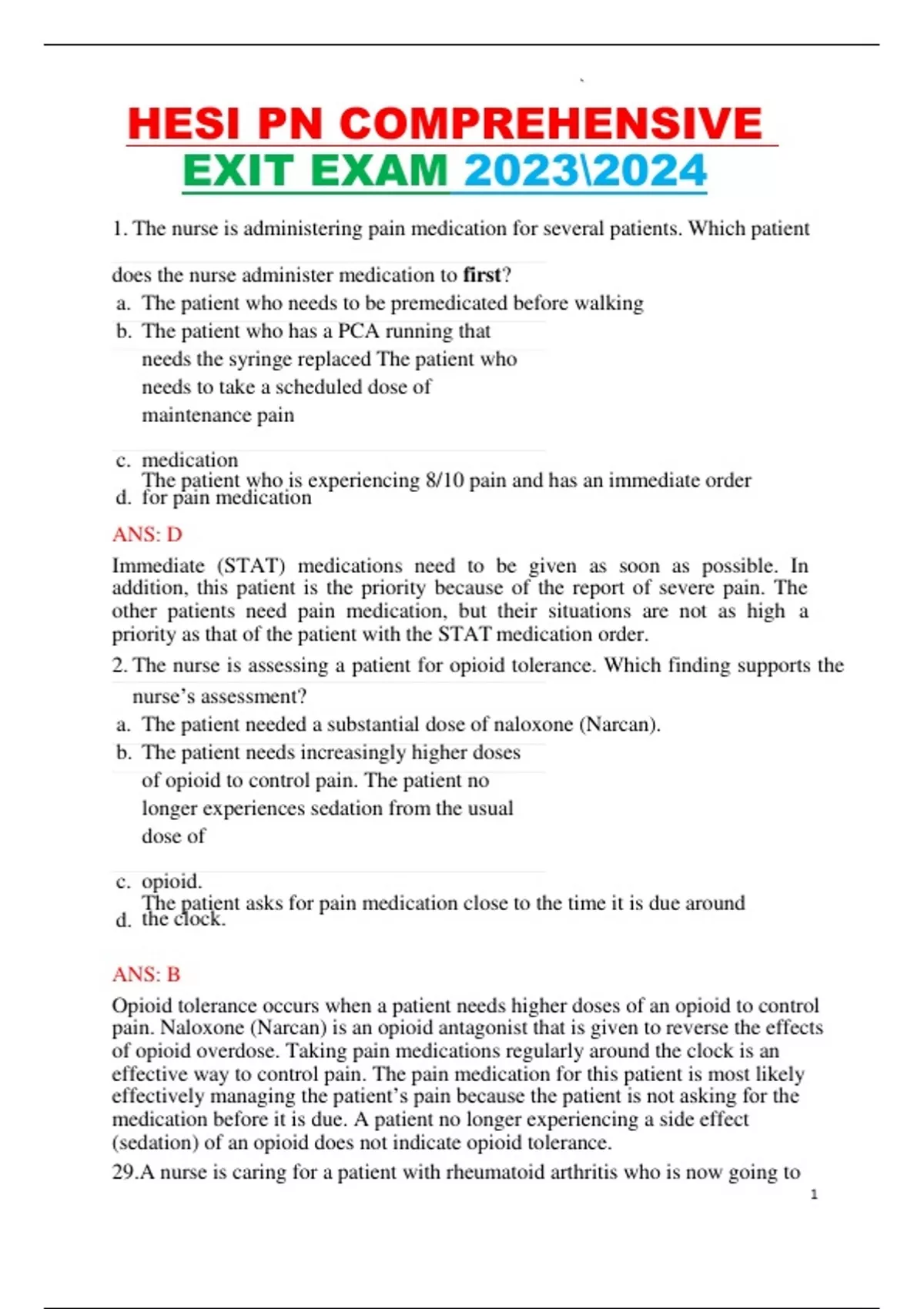HESI PN COMPREHENSIVE EXIT EXAM 1. The nurse is administering pain medication for several patients. Which patient does the nurse administer medication to first? a. The patient who needs to be premedicated before walking b. The patient who has a PCA running that needs the syringe replaced The patient who needs to take a scheduled dose of maintenance pain c. medication The patient who is experiencing 8/10 pain and has an immediate order for pain medication ANS: D Immediate (STAT) medications need to be given as soon as possible. In addition, this patient is the priority because of the report of severe pain. The other patients need pain medication, but their situations are not as high a priority as that of the patient with the STAT medication order. 2. The nurse is assessing a patient for opioid tolerance. Which finding supports the nurse’s assessment? a. The patient needed a substantial dose of naloxone (Narcan). b. The patient needs increasingly higher doses of opioid to control pain. The patient no longer experiences sedation from the usual dose of c. opioid. The patient asks for pain medication close to the time it is due around the clock. ANS: B Opioid tolerance occurs when a patient needs higher doses of an opioid to control pain. Naloxone (Narcan) is an opioid antagonist that is given to reverse the effects of opioid overdose. Taking pain medications regularly around the clock is an effective way to control pain. The pain medication for this patient is most likely effectively managing the patient’s pain because the patient is not asking for the medication before it is due. A patient no longer experiencing a side effect (sedation) of an opioid does not indicate opioid tolerance. 29.A nurse is caring for a patient with rheumatoid arthritis who is now going to 1 d. d. ` be taking 2 acetaminophen (Tylenol) tablets every 6 hours to control pain. Which part of the patient’s social history is the nurse most concerned about? a. Patient drinks 1 to 2 glasses of wine every night. b. Patient smokes 2 packs of cigarettes a day. c. Patient occasionally uses marijuana. d. Patient takes antianxiety medications. ANS: A The major adverse effect of acetaminophen is hepatotoxicity (liver toxicity). Because both alcohol and acetaminophen are metabolized by the liver, when taken together, they can cause liver damage. Smoking cigarettes and smoking marijuana are not healthy behaviors, but their effects on health are not affected by acetaminophen. Antianxiety medications can be taken with acetaminophen. 30. The nurse is caring for a patient who suddenly experiences chest pain. What is the nurse’s first priority? a. Call the rapid response team. b. Start an intravenous (IV) line. c. Administer pain-relief medications. d. Ask the patient to rate and describe the pain. ANS: D The nurse’s ability to establish a nursing diagnosis, plan and implement care, and evaluate the effectiveness of care depends on an accurate and timely assessment. The other responses are all interventions; the nurse cannot know which intervention is appropriate until the nurse completes the assessment. 31. The nurse is caring for a group of patients. Which task may the nurse delegate to the nursing assistive personnel (NAP)? a. Administer a back massage to a patient with pain. b. Assessment of pain for a patient reporting abdominal pain. c. Administer patient-controlled analgesia for a postoperative patient. d. Assessment of vital signs in a patient receiving epidural analgesia. 2 ` ANS: A A massage may be delegated to an NAP. Pain assessment is a nursing function and cannot be delegated to an NAP. Administration of patient-controlled analgesia (PCA) cannot be delegated to an NAP. Assessment of vital signs is a licensed nursing function; the NAP can take vital signs for a patient receiving epidural analgesia. 32.A nurse is caring for a patient with chronic pain from arthritis. Which action is best for the nurse to take? a. Give pain medications around the clock. c. G b iv . e Ap d a min inm is e t d e i r c p a a ti i o n n ma e ft d e i r ca th ti e on pa b in ef i o s re a a 7 n /1 y 0 a o c n tiv th it e y. pain scale. Administer pain medication only when nonpharmacological measures have failed. ANS: A When a patient with arthritis has chronic pain, the best way to manage pain is to take medication regularly throughout the day to maintain constant pain relief. “Before any activity” is nonspecific, and the medication may not have time to work before activity. If the patient waits until having pain (7/10) to take the medication, pain relief takes longer. Nonpharmacological measures are used in conjunction with medications unless requested otherwise by the patient. 33.A nurse is caring for a patient who fell on the ice and has connective tissue damage in the wrist and hand. The patient describes the pain as throbbing. Which type of pain does the nurse document in this patient’s medical record? a. Visceral pain b. Somatic pain c. Centrally generated pain d. Peripherally generated pain ANS: B Somatic pain comes from bone, joint, connective tissue, or muscle. Visceral pain arises from the visceral (internal) organs such as the GI tract and pancreas. Peripherally generated pain in the peripheral nerves can be caused by polyneuropathies or mononeuropathies. Centrally generated pain results from injury to the central or peripheral nervous system, causing deafferentation or sympathetically maintained pain.