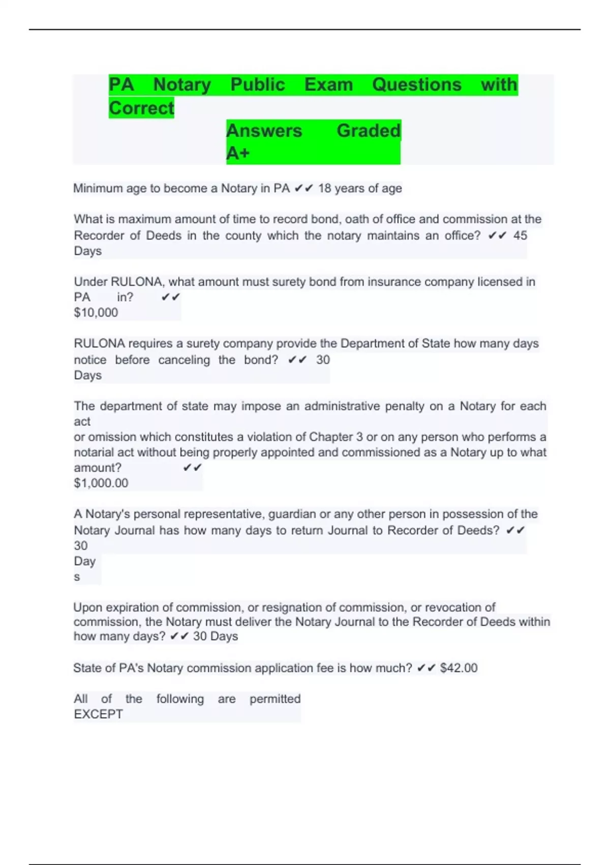 PA Notary Public Exam Questions with Correct Answers Graded A+