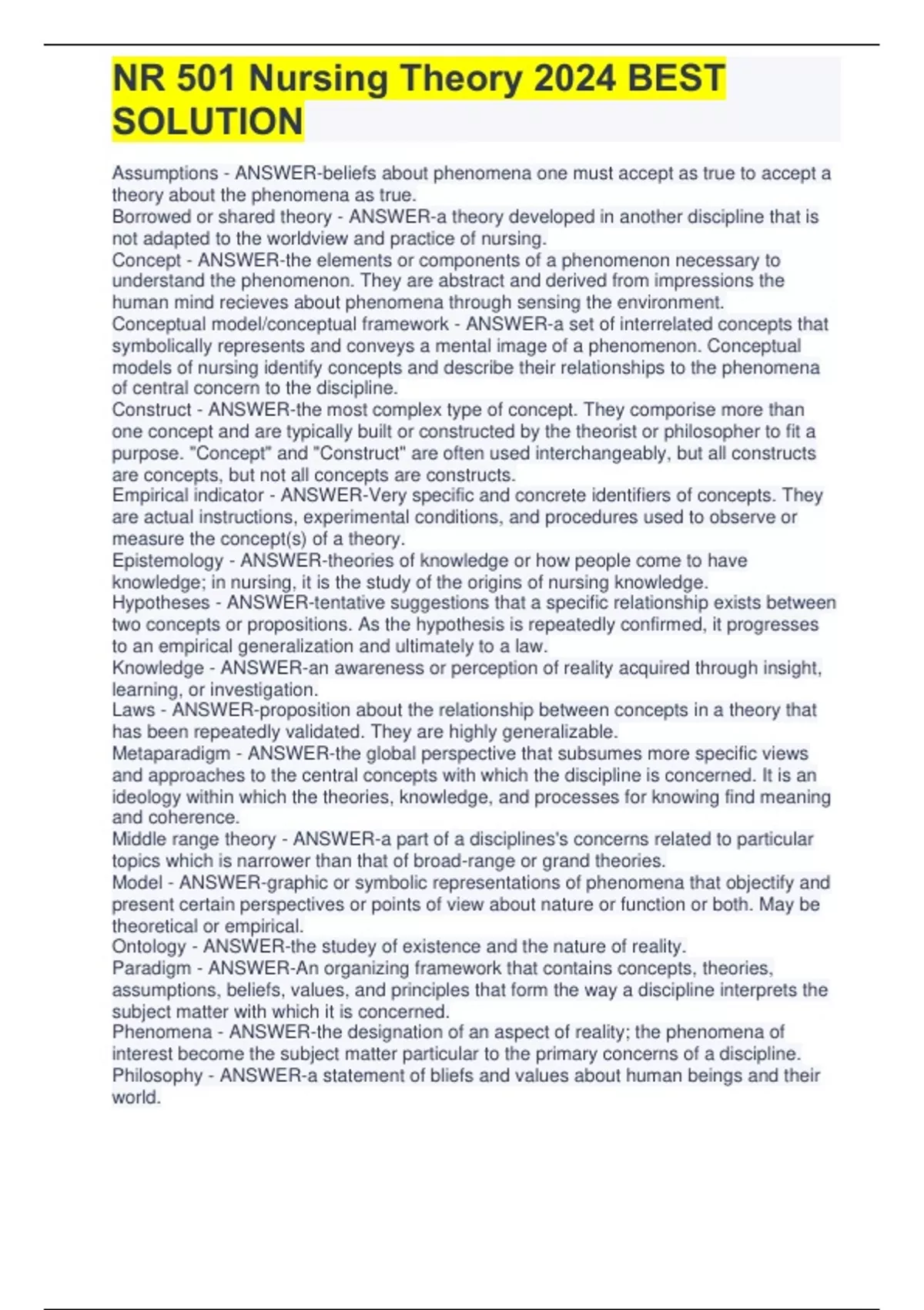 NR 501 Nursing Theory 2024 BEST SOLUTION Assumptions - ANSWER-beliefs about phenomena one must accept as true to accept a theory about the phenomena as true. Borrowed or shared theory - ANSWER-a theory developed in another discipline that is not adapted to the worldview and practice of nursing. Concept - ANSWER-the elements or components of a phenomenon necessary to understand the phenomenon. They are abstract and derived from impressions the human mind recieves about phenomena through sensing the environment. Conceptual model/conceptual framework - ANSWER-a set of interrelated concepts that symbolically represents and conveys a mental image of a phenomenon. Conceptual models of nursing identify concepts and describe their relationships to the phenomena of central concern to the discipline. Construct - ANSWER-the most complex type of concept. They comporise more than one concept and are typically built or constructed by the theorist or philosopher to fit a purpose. "Concept" and "Construct" are often used interchangeably, but all constructs are concepts, but not all concepts are constructs. Empirical indicator - ANSWER-Very specific and concrete identifiers of concepts. They are actual instructions, experimental conditions, and procedures used to observe or measure the concept(s) of a theory. Epistemology - ANSWER-theories of knowledge or how people come to have knowledge; in nursing, it is the study of the origins of nursing knowledge. Hypotheses - ANSWER-tentative suggestions that a specific relationship exists between two concepts or propositions. As the hypothesis is repeatedly confirmed, it progresses to an empirical generalization and ultimately to a law. Knowledge - ANSWER-an awareness or perception of reality acquired through insight, learning, or investigation. Laws - ANSWER-proposition about the relationship between concepts in a theory that has been repeatedly validated. They are highly generalizable. Metaparadigm - ANSWER-the global perspective that subsumes more specific views and approaches to the central concepts with which the discipline is concerned. It is an ideology within which the theories, knowledge, and processes for knowing find meaning and coherence. Middle range theory - ANSWER-a part of a disciplines's concerns related to particular topics which is narrower than that of broad-range or grand theories. Model - ANSWER-graphic or symbolic representations of phenomena that objectify and present certain perspectives or points of view about nature or function or both. May be theoretical or empirical. Ontology - ANSWER-the studey of existence and the nature of reality. Paradigm - ANSWER-An organizing framework that contains concepts, theories, assumptions, beliefs, values, and principles that form the way a discipline interprets the subject matter with which it is concerned. Phenomena - ANSWER-the designation of an aspect of reality; the phenomena of interest become the subject matter particular to the primary concerns of a discipline. Philosophy - ANSWER-a statement of bliefs and values about human beings and their world.