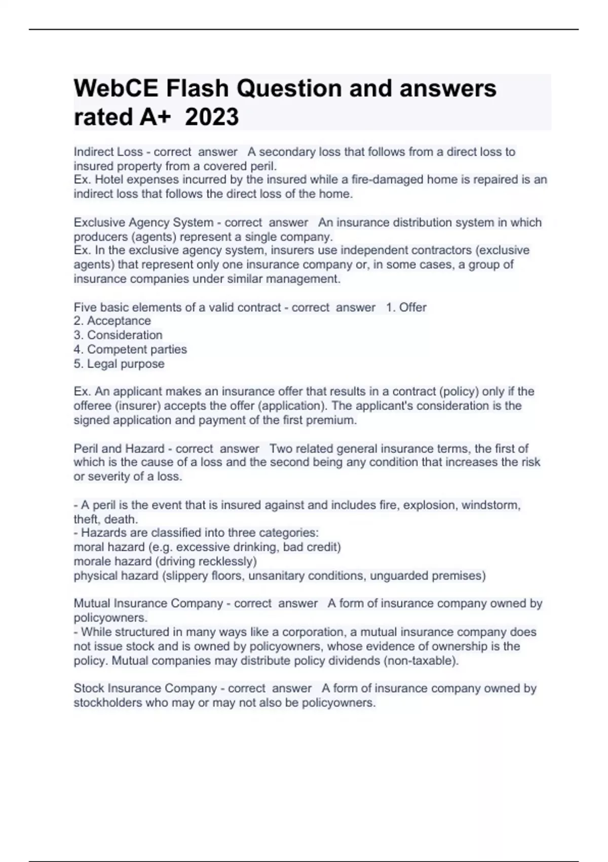 WEBCE Flash Questions and Correct answers rated A+ 2023/2024 Indirect Loss - correct answer A secondary loss that follows from a direct loss to insured property from a covered peril. Ex. Hotel expenses incurred by the insured while a fire-damaged home is repaired is an indirect loss that follows the direct loss of the home. Exclusive Agency System - correct answer An insurance distribution system in which producers (agents) represent a single company. Ex. In the exclusive agency system, insurers use independent contractors (exclusive agents) that represent only one insurance company or, in some cases, a group of insurance companies under similar management. Five basic elements of a valid contract - correct answer 1. Offer 2. Acceptance 3. Consideration 4. Competent parties 5. Legal purpose Ex. An applicant makes an insurance offer that results in a contract (policy) only if the offeree (insurer) accepts the offer (application). The applicant's consideration is the signed application and payment of the first premium. Peril and Hazard - correct answer Two related general insurance terms, the first of which is the cause of a loss and the second being any condition that increases the risk or severity of a loss. - A peril is the event that is insured against and includes fire, explosion, windstorm, theft, death. - Hazards are classified into three categories: moral hazard (e.g. excessive drinking, bad credit) morale hazard (driving recklessly) physical hazard (slippery floors, unsanitary conditions, unguarded premises) Mutual Insurance Company - correct answer A form of insurance company owned by policyowners. - While structured in many ways like a corporation, a mutual insurance company does not issue stock and is owned by policyowners, whose evidence of ownership is the policy. Mutual companies may distribute policy dividends (non-taxable). Stock Insurance Company - correct answer A form of insurance company owned by stockholders who may or may not also be policyowners. - Like all forms of corporations, stock insurance companies may be privately held or publicly traded and may distribute stock dividends (taxable). Law of Large Numbers - correct answer An actuarial principle that is the basis for predicting the odds of a loss occurring in a certain population in any given year. - The law of large numbers does not predict who will suffer a loss, only the odds of a loss. The larger the number of units independently exposed to a certain type of loss, the greater the probability that actual loss experience will equal predicted loss experience. Lloyd's Association - correct answer An association of individuals and companies that provide insurance to customers with complex, unique, and very large risks. - Lloyd's Associations in the United States are not related to Lloyd's of London. Based mostly in Texas, they are groups of insurers that mainly write fire insurance and auto physical damage insurance. Lloyd's associations play a relatively small role in the U.S. insurance market.