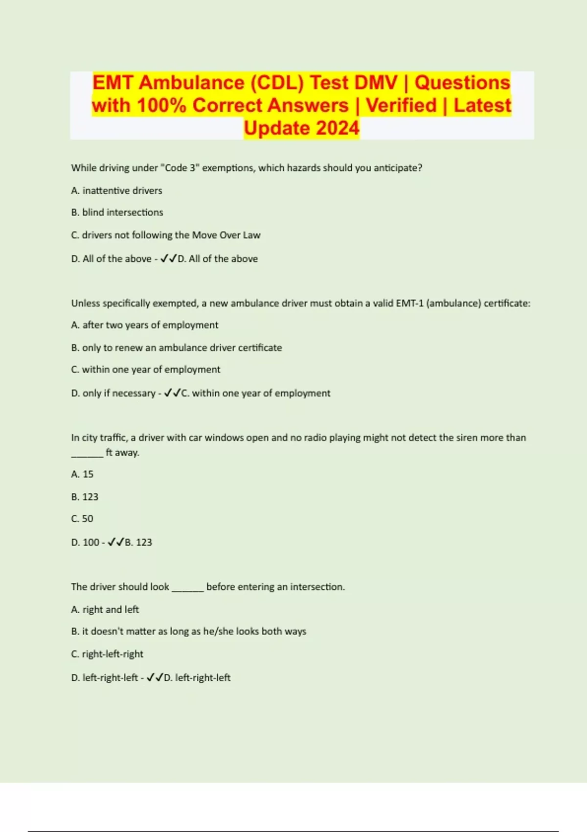 EMT Ambulance (CDL) Test DMV | Questions with 100% Correct Answers | Verified | Latest Update 2024