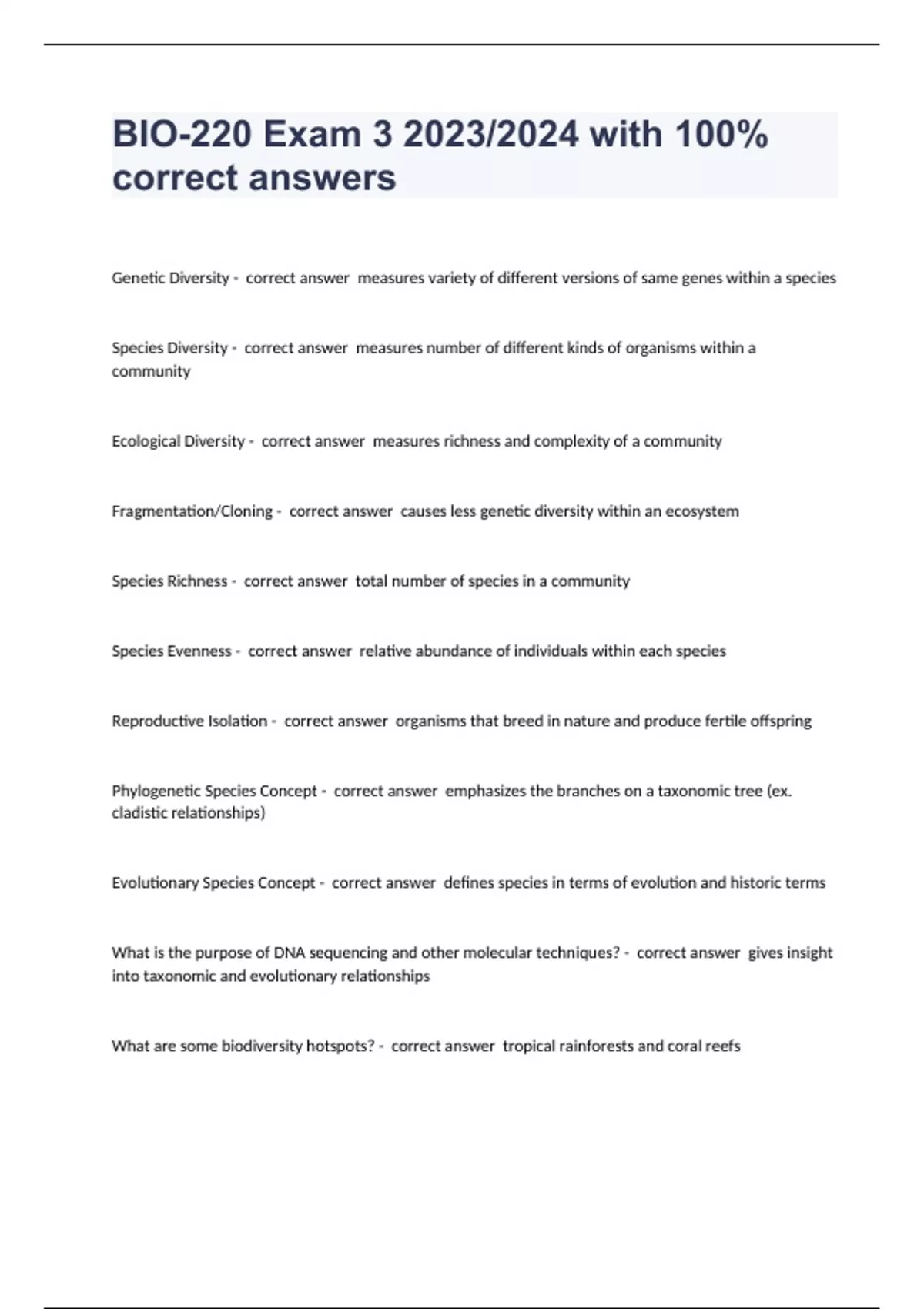 Genetic Diversity - correct answer measures variety of different versions of same genes within a species Species Diversity - correct answer measures number of different kinds of organisms within a community Ecological Diversity - correct answer measures richness and complexity of a community Fragmentation/Cloning - correct answer causes less genetic diversity within an ecosystem Species Richness - correct answer total number of species in a community Species Evenness - correct answer relative abundance of individuals within each species Reproductive Isolation - correct answer organisms that breed in nature and produce fertile offspring Phylogenetic Species Concept - correct answer emphasizes the branches on a taxonomic tree (ex. cladistic relationships) Evolutionary Species Concept - correct answer defines species in terms of evolution and historic terms What is the purpose of DNA sequencing and other molecular techniques? - correct answer gives insight into taxonomic and evolutionary relationships What are some biodiversity hotspots? - correct answer tropical rainforests and coral reefs