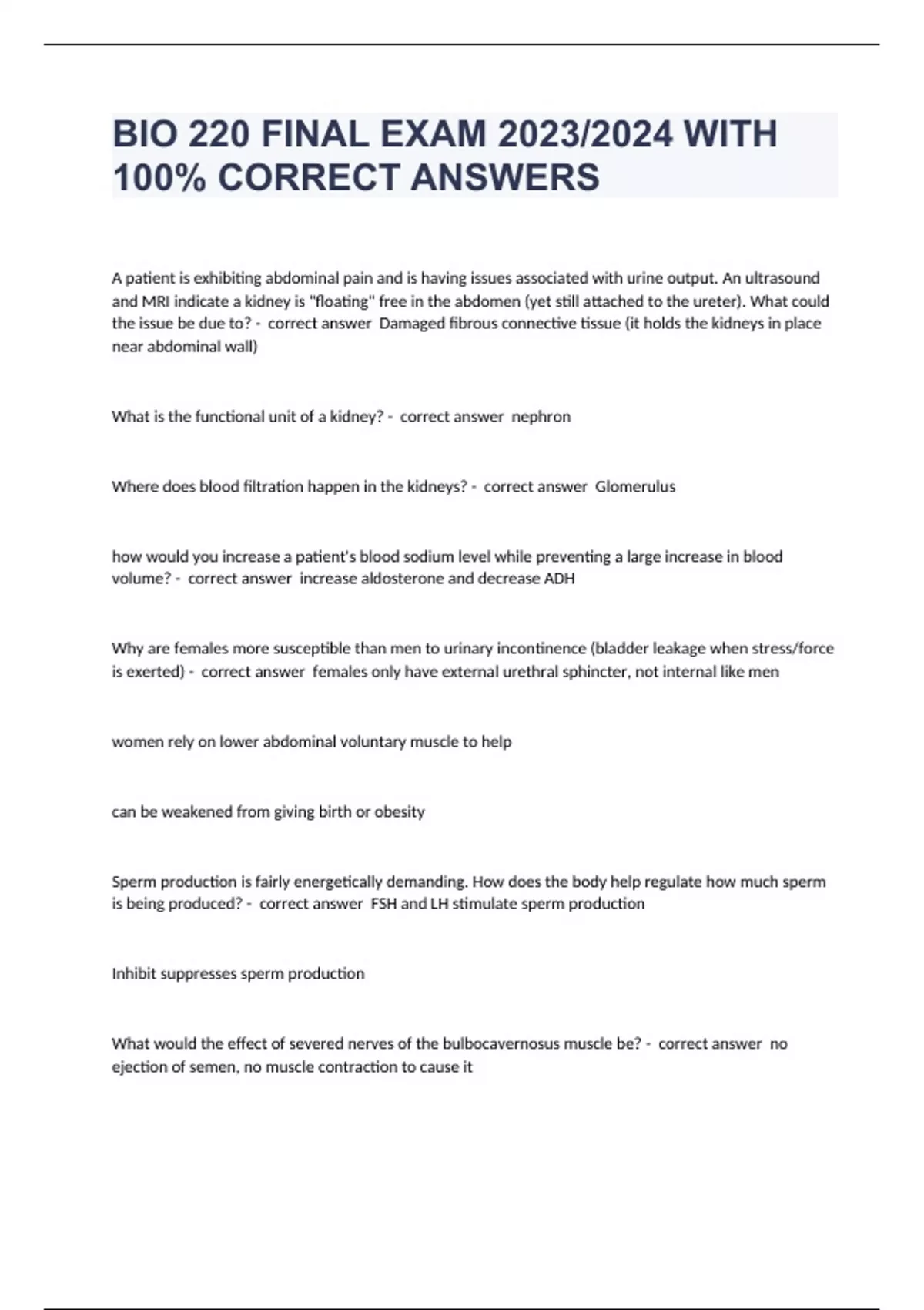 A patient is exhibiting abdominal pain and is having issues associated with urine output. An ultrasound and MRI indicate a kidney is "floating" free in the abdomen (yet still attached to the ureter). What could the issue be due to? - correct answer Damaged fibrous connective tissue (it holds the kidneys in place near abdominal wall) What is the functional unit of a kidney? - correct answer nephron Where does blood filtration happen in the kidneys? - correct answer Glomerulus how would you increase a patient's blood sodium level while preventing a large increase in blood volume? - correct answer increase aldosterone and decrease ADH Why are females more susceptible than men to urinary incontinence (bladder leakage when stress/force is exerted) - correct answer females only have external urethral sphincter, not internal like men women rely on lower abdominal voluntary muscle to help can be weakened from giving birth or obesity Sperm production is fairly energetically demanding. How does the body help regulate how much sperm is being produced? - correct answer FSH and LH stimulate sperm production Inhibit suppresses sperm production What would the effect of severed nerves of the bulbocavernosus muscle be? - correct answer no ejection of semen, no muscle contraction to cause it Why do o
