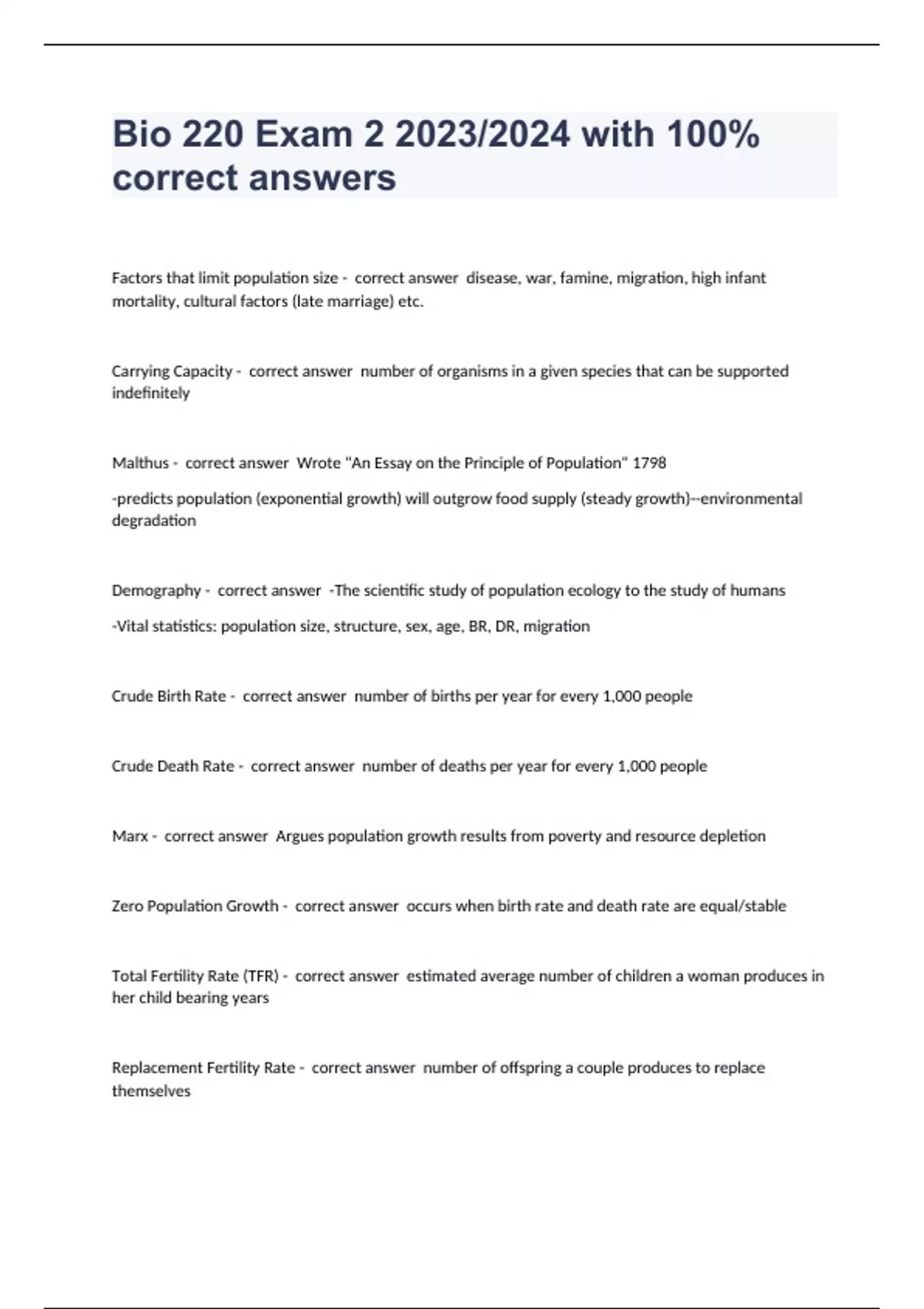 Factors that limit population size - correct answer disease, war, famine, migration, high infant mortality, cultural factors (late marriage) etc. Carrying Capacity - correct answer number of organisms in a given species that can be supported indefinitely Malthus - correct answer Wrote "An Essay on the Principle of Population" 1798 -predicts population (exponential growth) will outgrow food supply (steady growth)--environmental degradation Demography - correct answer -The scientific study of population ecology to the study of humans -Vital statistics: population size, structure, sex, age, BR, DR, migration Crude Birth Rate - correct answer number of births per year for every 1,000 people Crude Death Rate - correct answer number of deaths per year for every 1,000 people Marx - correct answer Argues population growth results from poverty and resource depletion Zero Population Growth - correct answer occurs when birth rate and death rate are equal/stable Total Fertility Rate (TFR) - correct answer estimated average number of children a woman produces in her child bearing years Replac