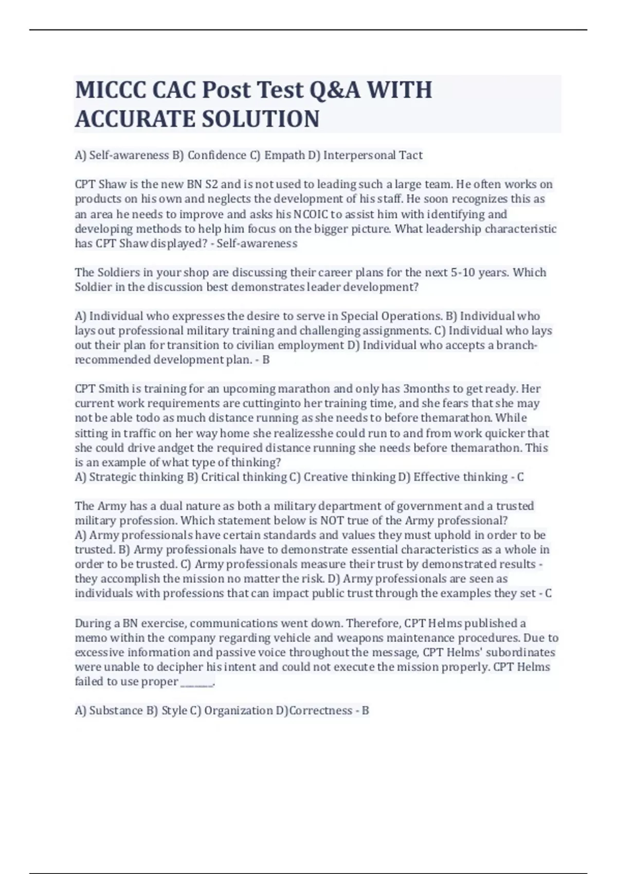 MICCC CAC Post Test Q&A WITH ACCURATE SOLUTION A) Self-awareness B) Confidence C) Empath D) Interpersonal Tact CPT Shaw is the new BN S2 and is not used to leading such a large team. He often works on products on his own and neglects the development of his staff. He soon recognizes this as an area he needs to improve and asks his NCOIC to assist him with identifying and developing methods to help him focus on the bigger picture. What leadership characteristic has CPT Shaw displayed? - Self-awareness The Soldiers in your shop are discussing their career plans for the next 5-10 years. Which Soldier in the discussion best demonstrates leader development? A) Individual who expresses the desire to serve in Special Operations. B) Individual who lays out professional military training and challenging assignments. C) Individual who lays out their plan for transition to civilian employment D) Individual who accepts a branch-recommended development plan. - B CPT Smith is training for an upcoming marathon and only has 3months to get ready. Her current work requirements are cuttinginto her training time, and she fears that she may not be able todo as much distance running as she needs to before themarathon. While sitting in traffic on her way home she realizesshe could run to and from work quicker that she could drive andget the required distance running she needs before themarathon. This is an example of what type of thinking? A) Strategic thinking B) Critical thinking C) Creative thinking D) Effective thinking - C The Army has a dual nature as both a military department of government and a trusted military profession. Which statement below is NOT true of the Army professional? A) Army professionals have certain standards and values they must uphold in order to be trusted. B) Army professionals have to demonstrate essential characteristics as a whole in order to be trusted. C) Army professionals measure their trust by demonstrated results - they accomplish the mission no matter the risk. D) Army professionals are seen as individuals with professions that can impact public trust through the examples they set - C During a BN exercise, communications went down. Therefore, CPT Helms published a memo within the company regarding vehicle and weapons maintenance procedures. Due to excessive information and passive voice throughout the message, CPT Helms' subordinates were unable to decipher his intent and could not execute the mission properly. CPT Helms failed to use proper _______. A) Substance B) Style C) Organization D)Correctness - B The Army Chief of Staff is scheduled to visit the Army Logistics University to provide a professional development briefing. As the staff officer in charge, you are responsible for reserving an auditorium and scheduling time away from the classroom. Also, it is your responsibility to invite all Captains Career Course students. Which step in the military briefing process is this an example of? A) Plan B) Organize C) Execute D)Assess - A What is the guiding principle of Talent Management and the overall purpose of the Army People Strategy? A) Have the right people, in the right place, at the right time, over time. B) Develop knowledge, skills, behaviors, and preferences (KSB-Ps) in every Soldier C) Build Soldiers that are trained, disciplined, and fit to win D) Overcome legal, cultural, and technological barriers. - A During a Joint Readiness Training Center rotation, CPT Felix continuously informs his battery of the battalion's mission while explaining the significance their fire support will have on the battalion and brigade's overall success. CPT Felix is influencing his Soldiers by providing them with what? A) Coaching B) Purpose C) Direction D)Motivation - B CPT Boyd received recognition from the brigade commander for setting up company situational training exercise (STX) lanes. This is an example of what type of counseling? A) Event-oriented counseling B)Performance counseling C)Professional growth counseling D)Promotion counseling - A After redeploying from Afghanistan all of your battalion's HMMWVs were upgraded with the latest Joint Capabilities Release (JCR) systems during reset. Each company within the battalion was given a time slot to have their vehicles in the motorpool maintenance bays so contractors could install the systems. What type of maintenance was this install? A)Sustainment Maintenance B)Field Maintenance C) Operator Tactical Maintenance D)Controlled Exchange Maintenance - A You are working on the BDE staff. The commander directs your team to exploit the adversary's network in support of mission objectives. You in turn coordinate the requirement with joint forces through the joint targeting process. You are involved in what specific type of cyberspace activity? A) Electronic Warfare Operations B)Offensive Cyber Operations C) Cyberspace Electromagnet Activities D)Defensive Cyber Operations - B You are a brigade planner preparing for operations whiledeployed to Latvia. What is an important space operationsadvantage the brigade has that allows for long range commandand control beyond line of site (BLOS)? A) Space Weather Prediction B)Global Positioning C) SATCOM D)ISR for real time information - C At the Battle of Gettysburg, COL Chamberlain used the analogy of a "swinging barn door" to describe how he wanted his unit to move into their attack position. Which Principle of Mission Command was he exercising when he did this? A) Risk Acceptance B) Disciplined Initiative C)Mission Orders D)Shared Understanding - D You are a member of an infantry battalion S4 section. Your battalion commander is driving the Operations Process for an upcoming mission. At one point, he gives his staff a list of key tasks he wants to accomplish. This is an example of which Principle of Mission Command? A)Commander's Intent B)Competence C) Mission Orders D)Shared Understanding - A Your battalion commander is reviewing the components of his command and control system. He recogniz