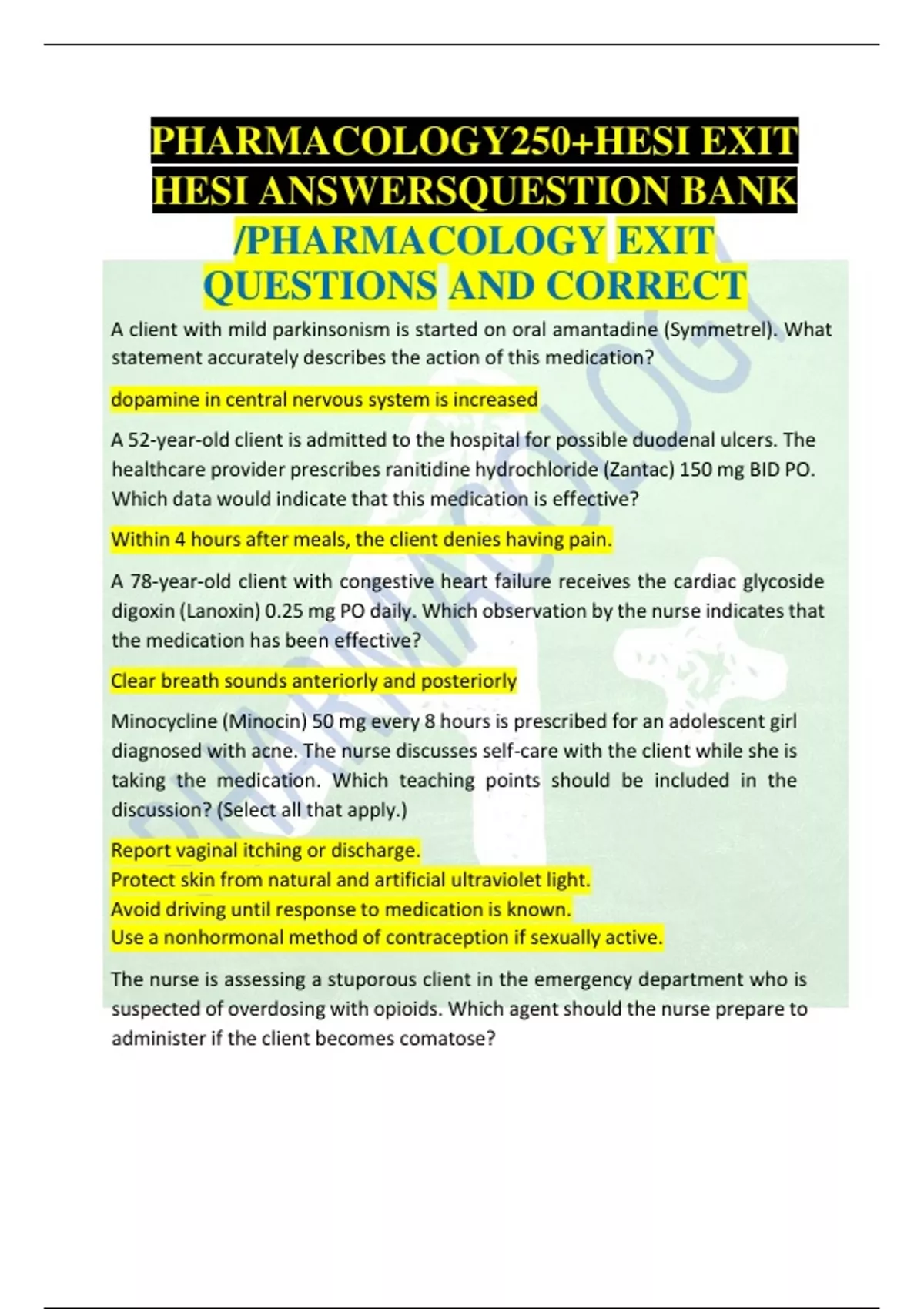 PHARMACOLOGY250+HESI EXIT HESI ANSWERSQUESTION BANK /PHARMACOLOGY EXIT QUESTIONS AND CORRECT