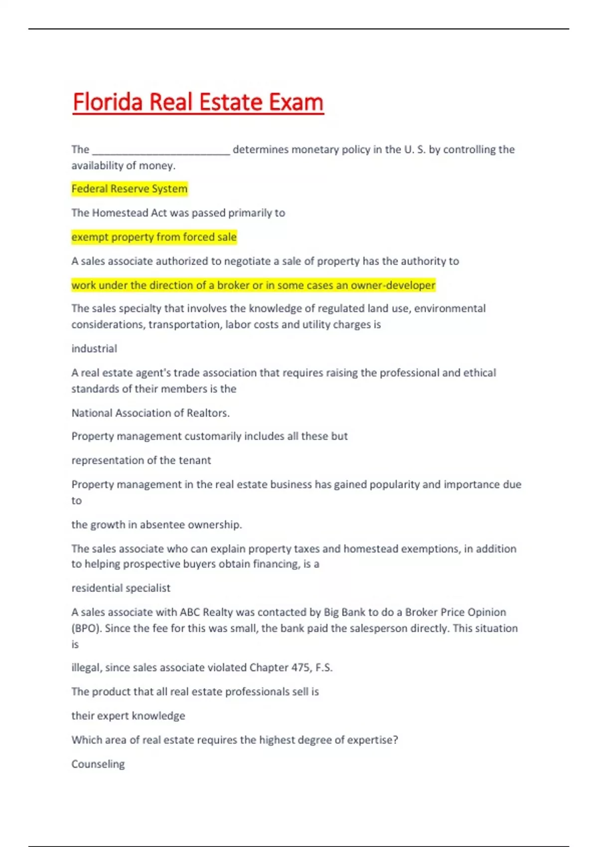 A sales associate authorized to negotiate a sale of property has the authority to work under the direction of a broker or in some cases an owner-developer The sales specialty that involves the knowledge of regulated land use, environmental considerations, transportation, labor costs and utility charges is industrial A real estate agent's trade association that requires raising the professional and ethical standards of their members is the National Association of Realtors. Property management customarily includes all these but representation of the tenant Property management in the real estate business has gained popularity and importance due to the growth in absentee ownership. The sales associate who can explain property taxes and homestead exemptions, in addition to helping prospective buyers obtain financing, is a residential specialist A sales associate with ABC Realty was contacted by Big Bank to do a Broker Price Opinion (BPO). Since the fee for this was small, the bank paid the salesperson directly. This situation is illegal, since sales associate violated Chapter 475, F.S. The product that all real estate professionals sell is their expert knowledge Which area of real estate requires the highest degree of expertise? Counseling