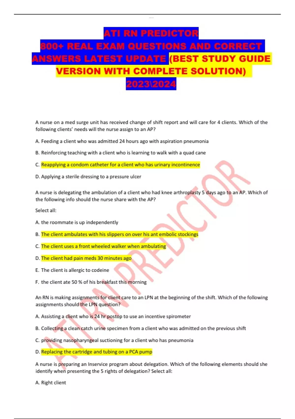 ATI RN PREDICTOR 800+ REAL EXAM QUESTIONS AND CORRECT ANSWERS LATEST UPDATE (BEST STUDY GUIDE VERSION WITH COMPLETE SOLUTION) A nurse on a med surge unit has received change of shift report and will care for 4 clients. Which of the following clients’ needs will the nurse assign to an AP? A. Feeding a client who was admitted 24 hours ago with aspiration pneumonia B. Reinforcing teaching with a client who is learning to walk with a quad cane C. Reapplying a condom catheter for a client who has urinary incontinence D. Applying a sterile dressing to a pressure ulcer A nurse is delegating the ambulation of a client who had knee arthroplasty 5 days ago to an AP. Which of the following info should the nurse share with the AP? Select all: A. the roommate is up independently B. The client ambulates with his slippers on over his ant embolic stockings C. The client uses a front wheeled walker when ambulating D. The client had pain meds 30 minutes ago E. The client is allergic to codeine F. the client ate 50 % of his breakfast this morning