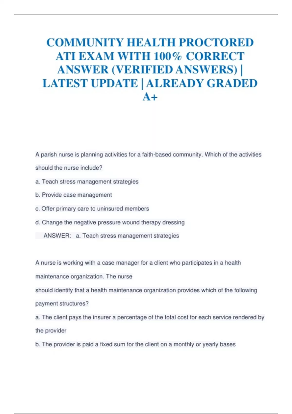 A parish nurse is planning activities for a faith-based community. Which of the activities should the nurse include? a. Teach stress management strategies b. Provide case management c. Offer primary care to uninsured members d. Change the negative pressure wound therapy dressing ANSWER: a. Teach stress management strategies A nurse is working with a case manager for a client who participates in a health maintenance organization. The nurse should identify that a health maintenance organization provides which of the following payment structures? a. The client pays the insurer a percentage of the total cost for each service rendered by the provider b. The provider is paid a fixed sum for the client on a monthly or yearly bases