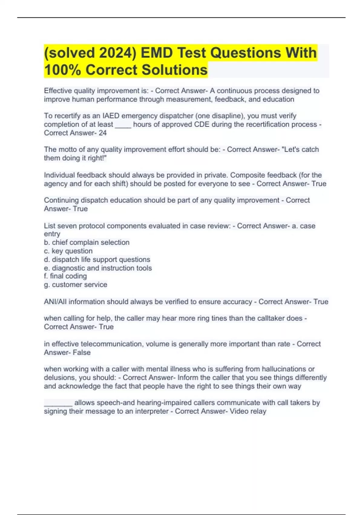 (solved 2024) EMD Test Questions With 100% Correct Solutions Effective quality improvement is: - Correct Answer- A continuous process designed to improve human performance through measurement, feedback, and education To recertify as an IAED emergency dispatcher (one disapline), you must verify completion of at least ____ hours of approved CDE during the recertification process - Correct Answer- 24 The motto of any quality improvement effort should be: - Correct Answer- "Let's catch them doing it right!" Individual feedback should always be provided in private. Composite feedback (for the agency and for each shift) should be posted for everyone to see - Correct Answer- True Continuing dispatch education should be part of any quality improvement - Correct Answer- True List seven protocol components evaluated in case review: - Correct Answer- a. case entry b. chief complain selection c. key question d. dispatch life support questions e. diagnostic and instruction tools f. final coding g. customer service ANI/AlI information should always be verified to ensure accuracy - Correct Answer- True when calling for help, the caller may hear more ring tines than the calltaker does - Correct Answer- True in effective telecommunication, volume is generally more important than rate - Correct Answer- False when working with a caller with mental illness who is suffering from hallucinations or delusions, you should: - Correct Answer- Inform the caller that you see things differently and acknowledge the fact that people have the right to see things their own way _______ allows speech-and hearing-impaired callers communicate with call takers by signing their message to an interpreter - Correct Answer- Video relay Studies show that ECCS for most emergency callers in between: - Correct Answer- 1 and 2 The "hysteria threshold" refers to: - Correct Answer- The point at which a caller loses control over her/his action and emotions When using the repetitive persistence technique, the caller should repeat a statement verbatim using a firm but caring tone. The statement should include: - Correct Answer- An action and a reason for this action Silent "gaps" during a call can elevate caller anxiety - Correct Answer- True List five techniques for working with child callers: - Correct Answer- a. ask to speak to an adult when necessary b. get to the child's level c. determine the correct address d. determine the correct callback number e. tell the child to stay on the line List three questions you should ask yourself when working with foreign-language callers: - Correct Answer- a. does the caller know enough of my language to communicate b. how do I obtain foreign-language support c. when should I send the intial response List four techniques of call management: - Correct Answer- a. minimize call-processing gaps b. focus on the callers message, not the way it'a delivered c. acknowledge the callers emotion d. use calming techniques throughout the call Select the best definition for "code of ethics" from the following list: - Correct Answer- Standards of conduct established by a professional organization Which of the following best describes a difference between criminal and civil law? - Correct Answer- Civil law exists to resolve conflicts between individuals and/or organizations. Criminal law is enacted to protect society