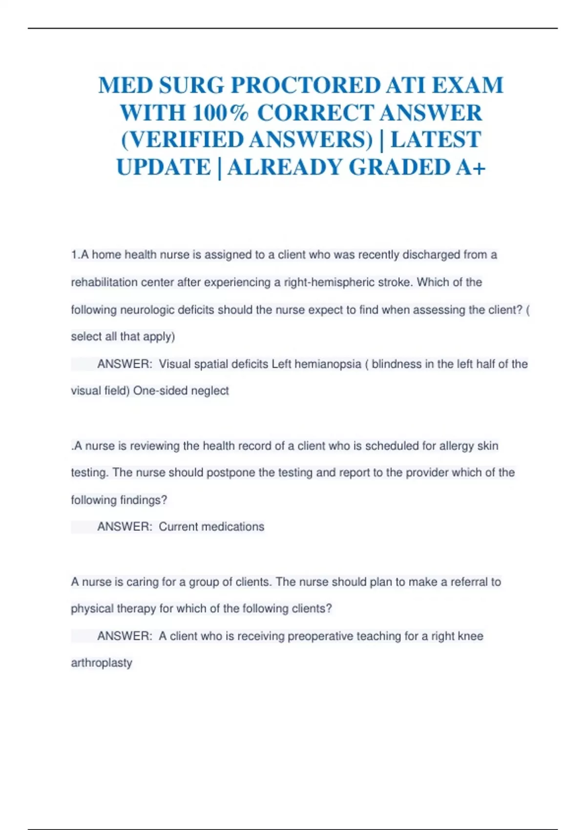 1.A home health nurse is assigned to a client who was recently discharged from a rehabilitation center after experiencing a right-hemispheric stroke. Which of the following neurologic deficits should the nurse expect to find when assessing the client? ( select all that apply) ANSWER: Visual spatial deficits Left hemianopsia ( blindness in the left half of the visual field) One-sided neglect .A nurse is reviewing the health record of a client who is scheduled for allergy skin testing. The nurse should postpone the testing and report to the provider which of the following findings? ANSWER: Current medications A nurse is caring for a group of clients. The nurse should plan to make a referral to physical therapy for which of the following clients? ANSWER: A client who is receiving preoperative teaching for a right knee arthroplasty