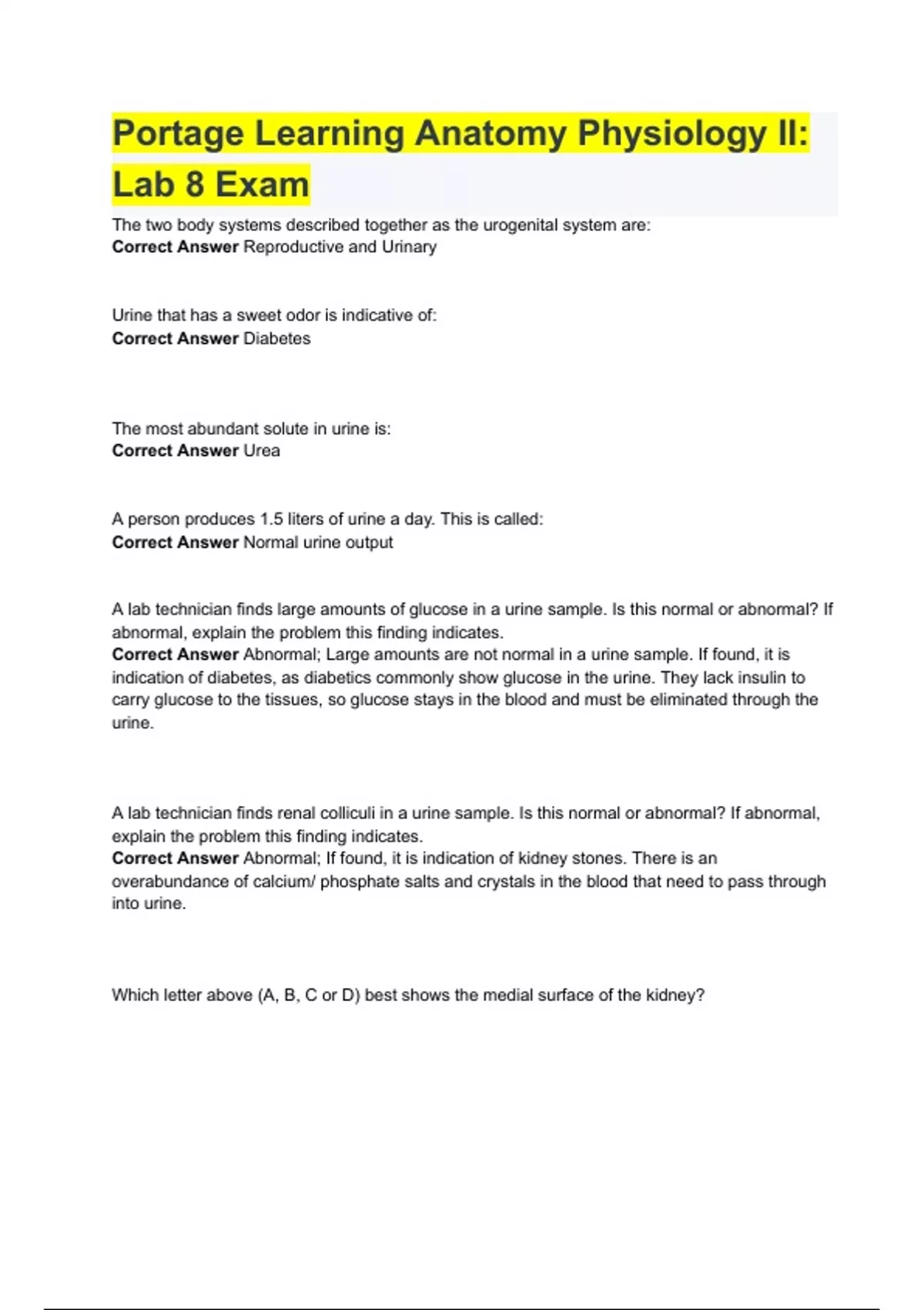 Portage Learning Anatomy Physiology II: Lab 8 Exam 2024 Latest Questions and Answers (Verified by Expert)