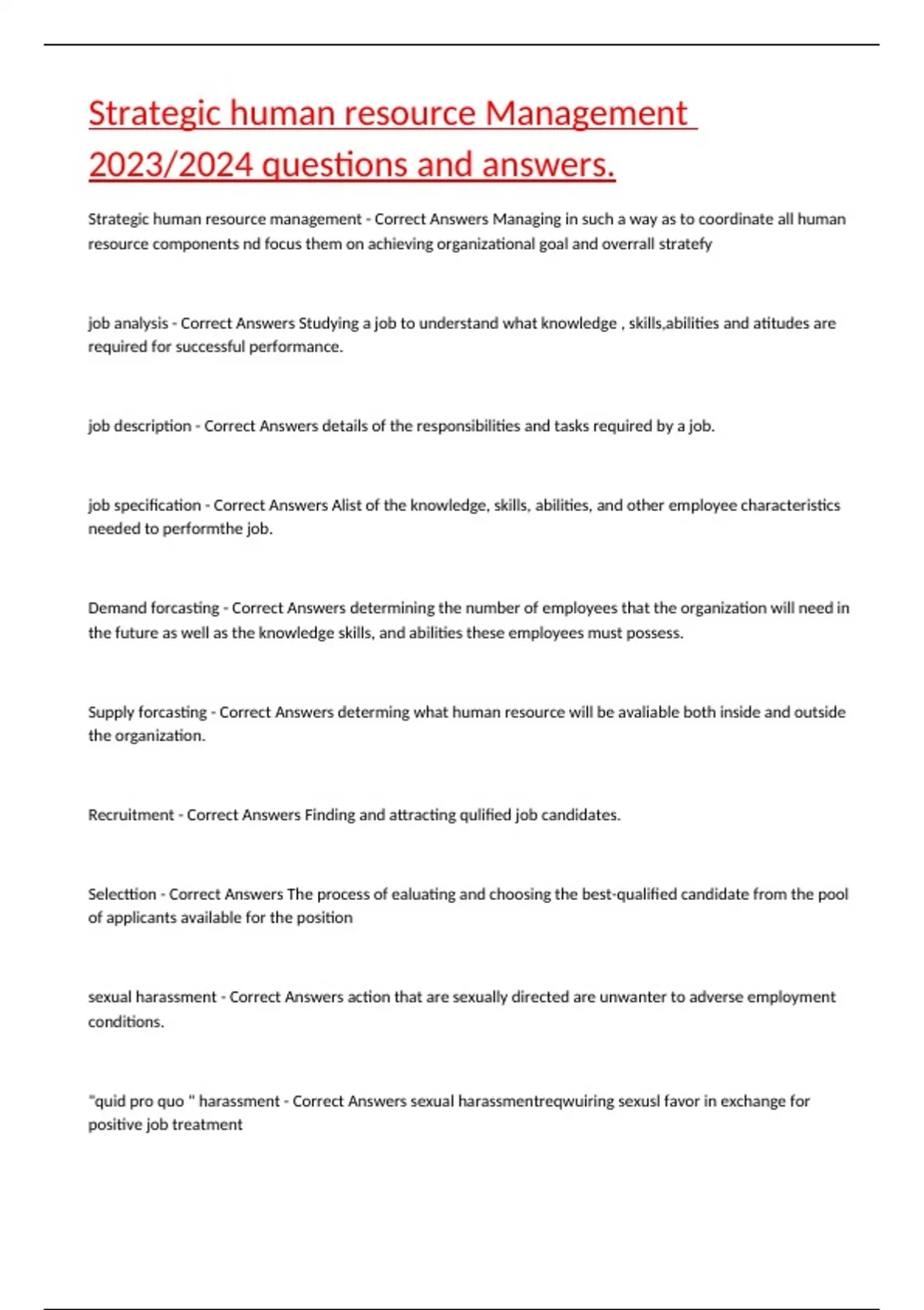 Strategic human resource management - Correct Answers Managing in such a way as to coordinate all human resource components nd focus them on achieving organizational goal and overrall stratefy job analysis - Correct Answers Studying a job to understand what knowledge , skills,abilities and atitudes are required for successful performance. job description - Correct Answers details of the responsibilities and tasks required by a job. job specification - Correct Answers Alist of the knowledge, skills, abilities, and other employee characteristics needed to performthe job. Demand forcasting - Correct Answers determining the number of employees that the organization will need in the future as well as the knowledge skills, and abilities these employees must possess. Supply forcasting - Correct Answers determing what human resource will be avaliable both inside and outside the organization. Recruitment - Correct Answers Finding and attracting qulified job candidates. Selecttion - Correct Answers The process of ealuating and choosing the best-qualified candidate from the pool of applicants available for the position sexual harassment - Correct Answers action that are sexually directed are unwanter to adverse employment conditions. "quid pro quo " harassment - Correct Answers sexual harassmentreqwuiring sexusl favor in exchange for positive job treatment Hostile environment harassment - Correct Answers Harassment produced by work place conduct and /or setting that is considered to make an abusive working environment. Labor-management relatons - Correct Answers the formal process throught which labor union respersent employees in negotiating with management. affirmative action - Correct Answers Emphasizing the reruiting, hiring and promting group and other protected classes if such individual are underrepresented in the organization Bona fide occupatinal qualification - Correct Answers of a job that is legaal to use even if it tend to rule out member of employee classes protected by title vll Internal fairness - Correct Answers Pay for the job within the organization is fair relative to the pay of higher- and lower level job in the same organization. Employee fairness - Correct Answers Expectation that individuals on a given job are paid fairly relative to coworkers on the same job. Benefits - Correct Answers indirect compensation given to employees as a reward for organizational membership External fairness - Correct Answers pay in one organization is fair relative to the pay for the same job in other organziations Contrast error - Correct Answers The tendency to rate employee relative to each other rather than to performance standard. Recency error - Correct Answers Evaluation on the employee's most recent performance rather than all of it Compensation - Correct Answers Direct and indirect payment to employees. 360- degree feedback - Correct Answers Feedback from the supvisor, subordinate ,coworkers and self- appraisal HAlo effect - Correct Answers Rating an employee high or low on all items because of one characteristic Central tendency - Correct Answers judging all employees as average even through their performance varies Leniency error - Correct Answers Evaluating someone in a group higher than the person should be rated or when the rater is unjustifiably easy in evaqluating performance. Severity error - Correct Answers Being unjustifiably harsh in evaluating employee performance. interview - Correct Answers a candidate readiness for a job, and to provide information to the