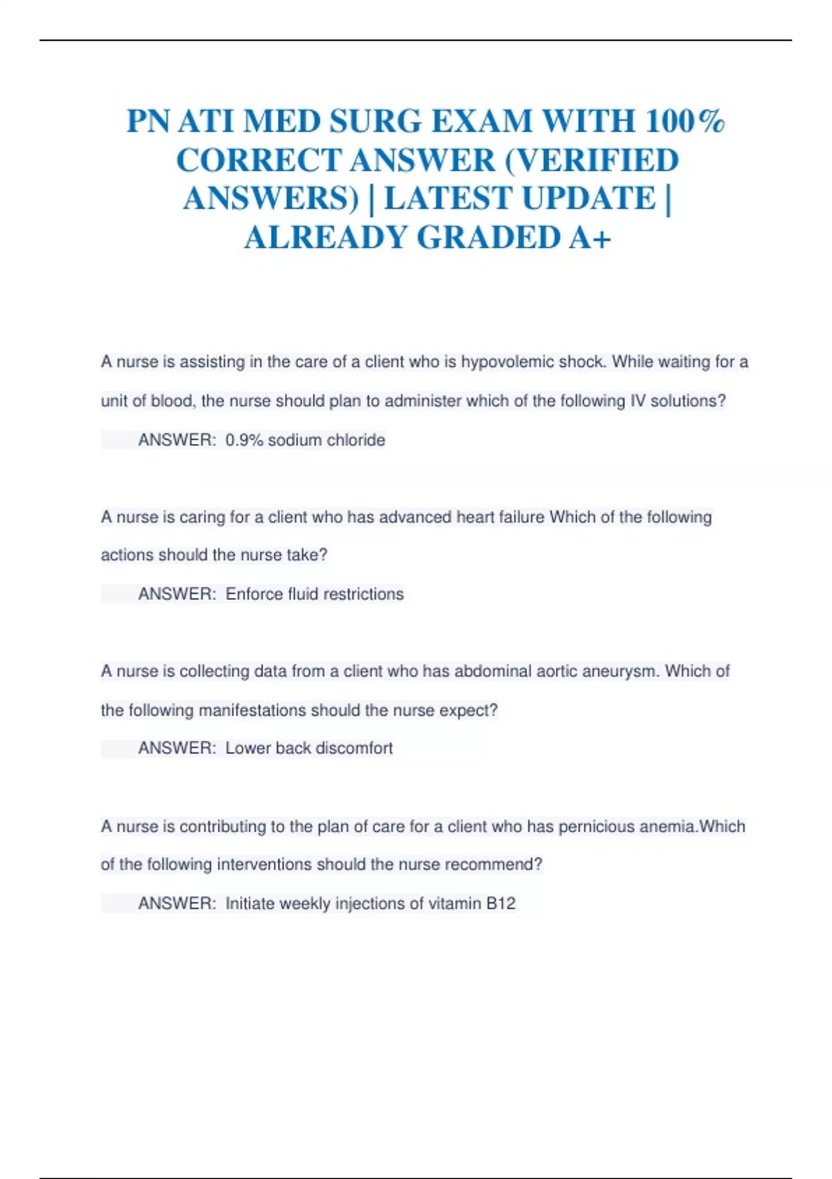 PN ATI MED SURG EXAM WITH 100% CORRECT ANSWER (VERIFIED ANSWERS) | LATEST UPDATE | ALREADY GRADED A+ A nurse is assisting in the care of a client who is hypovolemic shock. While waiting for a unit of blood, the nurse should plan to administer which of the following IV solutions? ANSWER: 0.9% sodium chloride A nurse is caring for a client who has advanced heart failure Which of the following actions should the nurse take? ANSWER: Enforce fluid restrictions A nurse is collecting data from a client who has abdominal aortic aneurysm. Which of the following manifestations should the nurse expect? ANSWER: Lower back discomfort A nurse is contributing to the plan of care for a client who has pernicious anemia.Which of the following interventions should the nurse recommend? ANSWER: Initiate weekly injections of vitamin B12 A nurse is reinforcing discharge teaching with a client who has a new permanent pacemaker. Which of the following information should the nurse include in the teaching? ANSWER: "Avoid lifting both arms above your head when dressing." A nurse is reinforcing teaching with a client who has anemia and a new prescription for epoetin Alfa. Which of the following information should the nurse include in the teaching? ANSWER: Hypertension is a common adverse effect of this medication A nurse is caring for a client who is postoperative following vein ligation and stripping for varicose veins. Which of the following actions should the nurse take? ANSWER: Position the client supine with his legs elevated when in bed A nurse is assisting in the care of a client who has an abdominal aortic aneurysm and is scheduled for surgery. The client's vital signs are BP 160/98, HR 102, R -22, SpO2 95%. Which of the following actions should the nurse take? ANSWER: Administer antihypertensive medication for blood pressure A nurse in a clinic is collecting data from a client who has a history of peripheral arterial disease. Which of the following findings on the client's lower extremities should the nurse expect? ANSWER: Cool, pale skin with minimal body hair A nurse is collecting data from a client who has manifestation of aplastic anemia. Which of the following findings should the nurse expect? ANSWER: Petechiae and ecchymosis A nurse is administering a loop diuretic to a client who has 3+ pitting edema in the lower extremities. Which of the following actions should the nurse take? ANSWER: Monitor the client for ototoxicity A nurse is assisting in developing the plan of care for an older adult client who is to receive a unto of packed RBCs. Which of the following action should the nurse recommend? ANSWER: Verify the information on the packed RBCs with another nurse A nurse is caring for a client who has late stage heart failure and is experiencing fluid volume overload. Which of the following findings should the nurse expect? ANSWER: Weight gain of 1 kg (2.2 lb) in 1 day A nurse is assisting in the preparation of a unit of packed RBCs for a client who has anemia. Which of the following actions should the nurse take first? ANSWER: Witness the informed consent A nurse is collecting data from a client who has fluid volume overload resulting from a cardiovascular disorder. Which of the following manifestations should the nurse expect? ANSWER: Jugular vein dissent ion, moist crackles, increases heart rate A nurse is evaluating a client's repeat laboratory results 4 hr after administering fresh frozen plasma. Which of the following laboratory test should the nurse review? ANSWER: Prothrombin time A nurse is caring for a client who has hemophilia. The client reports pain and swelling in a joint following an injury. Which of the following actions should the nurse take? ANSWER: Prepare for replacement of the missing clotting factor A nurse is assisting in collecting data from a client who has a history of unstable angina. Which of the following findings should the nurse expect? ANSWER: The client reports chest pain when at rest A nurse is reinforcing teaching about lifestyle changes with a client who had a MI and has a new prescription for a beta blocker. Which of the following client statements indicates an understanding of the teaching? ANSWER: Before taking my medication, I will check my blood pressure and radial pulse rate A nurse is collecting data from a client who has right sided heart failure. Which of the following findings should the nurse expect? ANSWER: Dependent edema