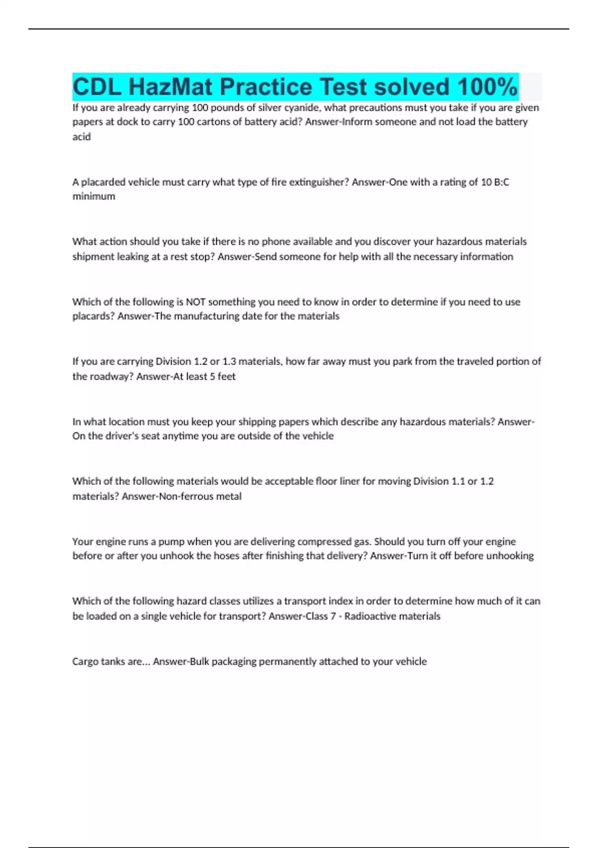 CDL HazMat Practice Test solved 100% If you are already carrying 100 pounds of silver cyanide, what precautions must you take if you are given papers at dock to carry 100 cartons of battery acid? Answer-Inform someone and not load the battery acid A placarded vehicle must carry what type of fire extinguisher? Answer-One with a rating of 10 B:C minimum What action should you take if there is no phone available and you discover your hazardous materials shipment leaking at a rest stop? Answer-Send someone for help with all the necessary information Which of the following is NOT something you need to know in order to determine if you need to use placards? Answer-The manufacturing date for the materials If you are carrying Division 1.2 or 1.3 materials, how far away must you park from the traveled portion of the roadway? Answer-At least 5 feet In what location must you keep your shipping papers which describe any hazardous materials? Answer-On the driver's seat anytime you are outside of the vehicle Which of the following materials would be acceptable floor liner for moving Division 1.1 or 1.2 materials? Answer-Non-ferrous metal Your engine runs a pump when you are delivering compressed gas. Should you turn off your engine before or after you unhook the hoses after finishing that delivery? Answer-Turn it off before unhooking Which of the following hazard classes utilizes a transport index in order to determine how much of it can be loaded on a single vehicle for transport? Answer-Class 7 - Radioactive materials Cargo tanks are... Answer-Bulk packaging permanently attached to your vehicle Which hazard classes must you NEVER smoke, or perform any activity involving fire, within 25 feet of? Answer-Classes 1, 3, 4 and 4.2 What is a technical name? Answer-The name for a hazardous material used in scientific journals and texts, recognized as its chemical and microbiological name What are shippers trying to accomplish when they package the material? Answer-Make it easy to identify A safe haven is... Answer-A place that has been approved to park unattended vehicles carrying explosives