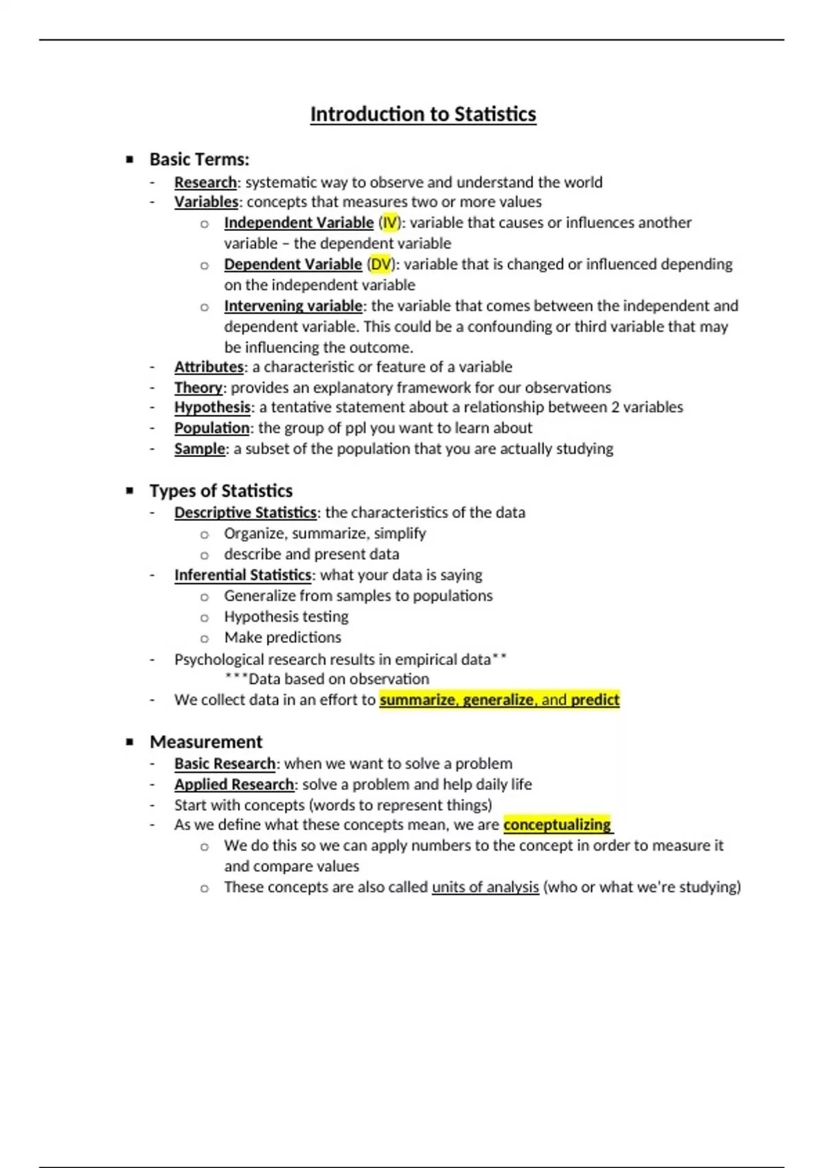 Notes on basics of statistics and how they can be applied to psychology.
